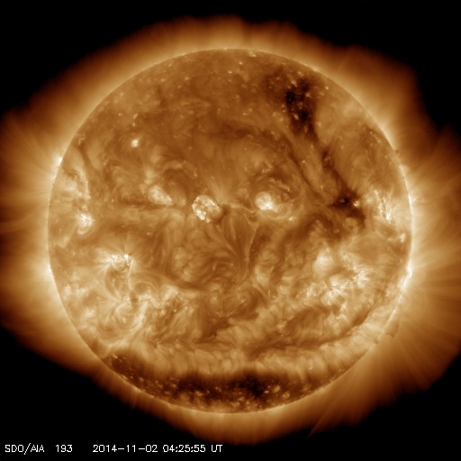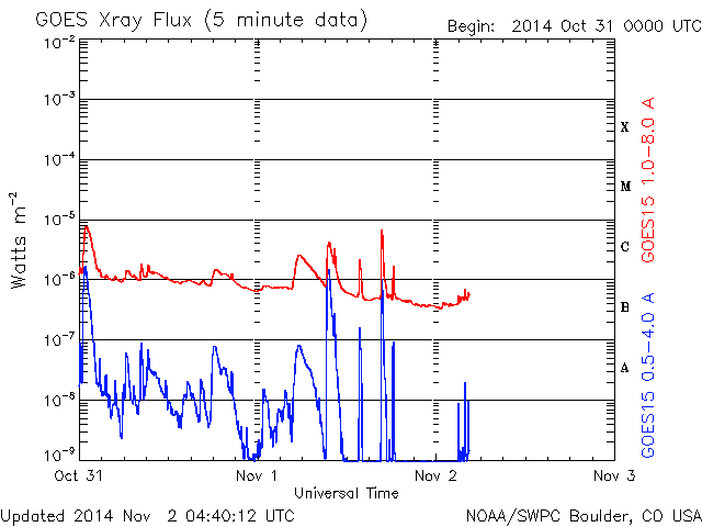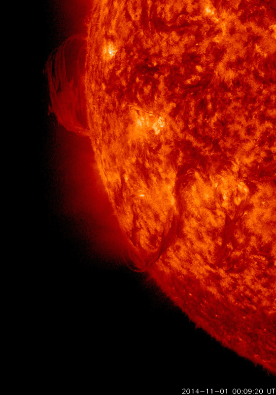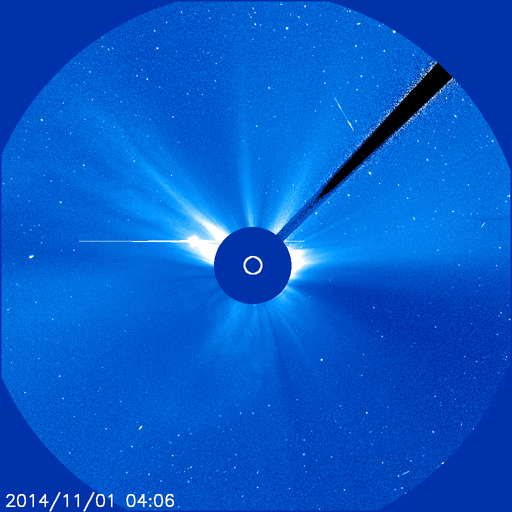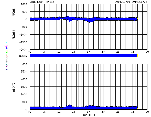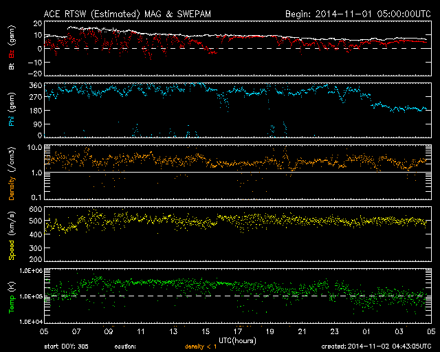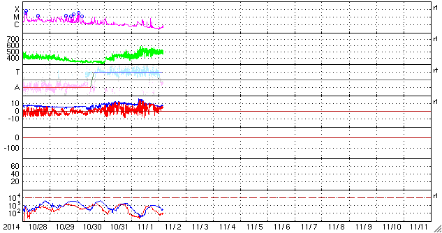 2014/11/ 2 13:43 更新 太陽の南東でフィラメント噴出が発生しました。太陽風は高速風に変わっています。 担当 篠原 昨日昼、11月1日14時(世界時1日5時)頃に、 太陽の南東部(左下)で、 ダークフィラメントの噴出が発生しました。 SDO衛星AIA304の動画を掲載します。 太陽から少し浮き上がった黒い帯(ダークフィラメント)が、 急に上昇を始め、周囲に飛び出していきます。 この噴出はCME(太陽ガスの放出現象)となり、 SOHO衛星LASCO C3の動画で見ることができます。 白いガスは太陽から左に向かって噴き出しています。 このため、地球への影響はないでしょう。 太陽では、東側の2201群の活動が活発で、 C4.1、C2.6、C7.2、C2.3と、 小規模フレアを起こし続けています。 2201群は、黒点としてはまだ小さい規模です。 今後発達するようだと、注意が必要になるでしょう。 太陽風は、昨日のニュースの後に、 速度が500km/秒に上がって、高速風に変わっています。 SDO衛星AIA193の北半球側に見えていた コロナホールの影響が及んでいるのかもしれません。 27日周期の図の前周期には見られなかった変化です。 太陽風の磁場強度は、 1日15時半(世界時1日6時半)に15nTへ急に強まる変化が発生し、 その後ゆっくりと下がりますが、 現在も8nTとやや強めです。 磁場の南北成分は北寄りの傾向が続いています。 このため、太陽風は強まりましたが磁気圏は静穏で、 AE指数は目立った変化なく推移しています。 27日前の前周期は、 この後、セクターの切り替わりがやって来て、 太陽風磁場は南寄りに変わり、 オーロラの活動が高まっています。 今回もこれから同様の変化が見られるかもしれません。