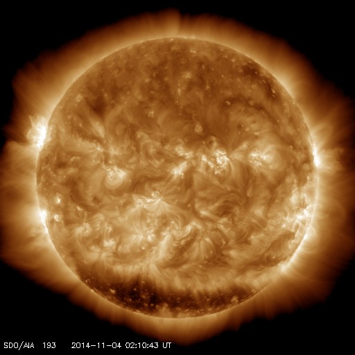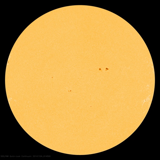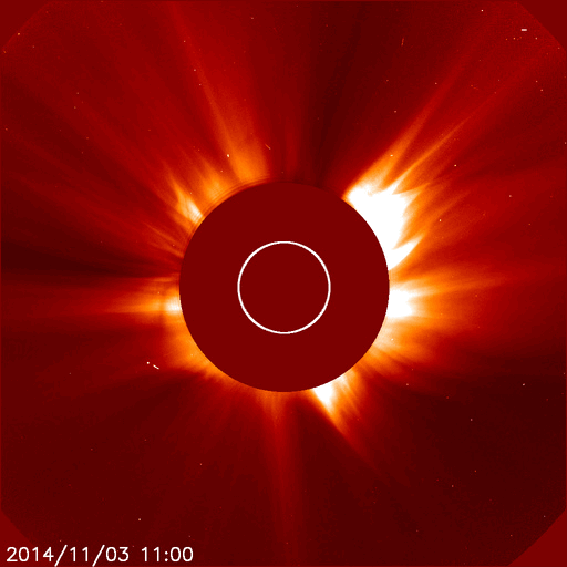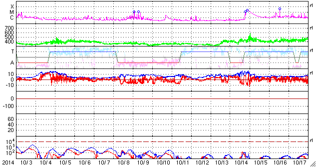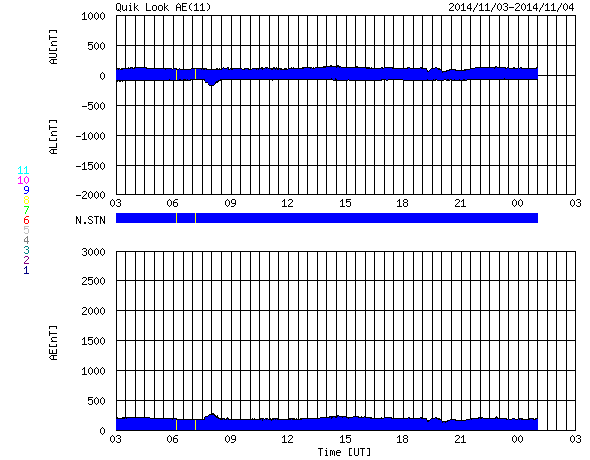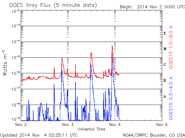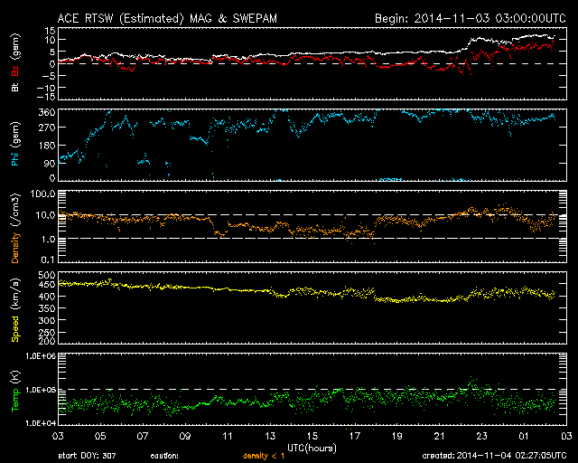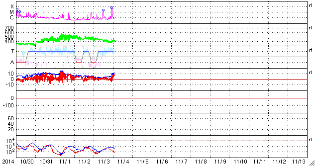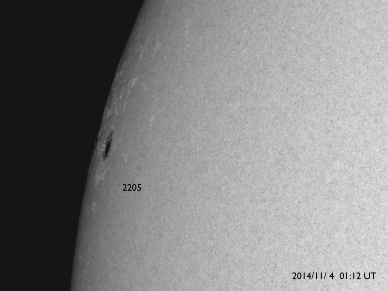 2014/11/ 4 11:27 更新 太陽の東端で、M2.2、M6.5の中規模フレアが発生しました。黒点も姿を現しています。 担当 篠原 太陽の東端(左端)でフレアの発生が続いています。 昨夜、3日20時半(世界時3日11時半)にM2.2、 今朝、4日7時半(世界時3日22時半)にはM6.5と、 2つの中規模フレアが発生し、 規模も次第に大きくなっています。 SDO衛星の可視光写真ではいよいよ黒点が姿を現し、 2205黒点群と番号が付けられています。 現在見えている部分では、黒点はそれほど大きくない様ですが、 この後更に黒点が見えてくるのかもしれません。 フレアの規模もだいぶ大きくなっているので、 今後の活動に注目して下さい。 また、2つのMフレアに伴って、 CME(太陽ガスの放出現象)も観測されています。 SOHO衛星LASCO C2の動画を掲載します。 太陽の左に向かって、白いガスが2度噴き出しています。 動画ではこの他にも、右向き、左下向きのCMEが写っています。 太陽の裏側で発生した現象の様で、 太陽のあちこちで活動が発生している様です。 太陽風は、速度は450km/秒から400km/秒へ下がる一方、 磁場強度は3nTから10nTへ強まっています。 強まりは、今朝、4日7時(世界時3日22時)頃から始まっています。 磁場の南北成分は北向きの状態が続いています。 このため、磁気圏の活動は穏やかで、 AE指数は全く変化していません。 27日周期の図を見ると、 太陽風磁場の強まりは、前周期の10月8日にも到来しています。 ただし、この時はセクターの切り替わりを伴っていて、 以降、磁場が南向きに振れて磁気圏の活動を高めていました。 今回は、磁場は強まったものの、 セクターは切り替わらず、 磁場の南北成分は北寄りの傾向が続いています。 引き続き、太陽風の変化に注目して下さい。