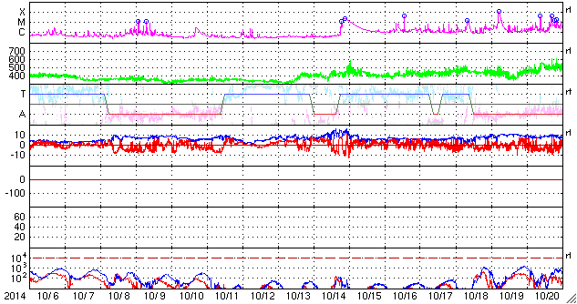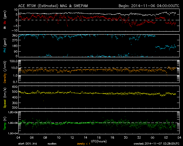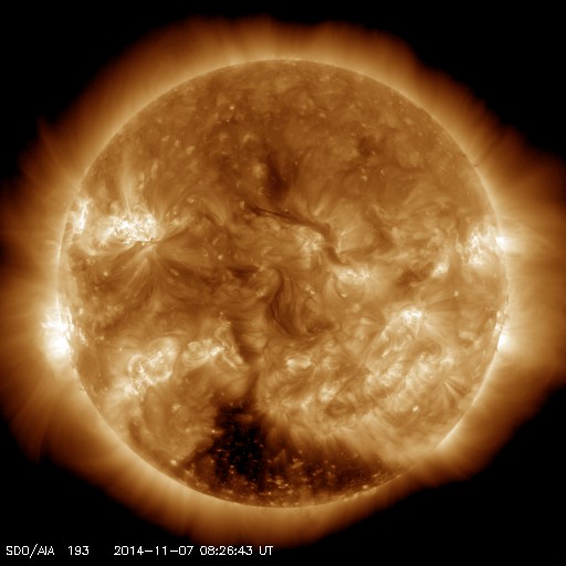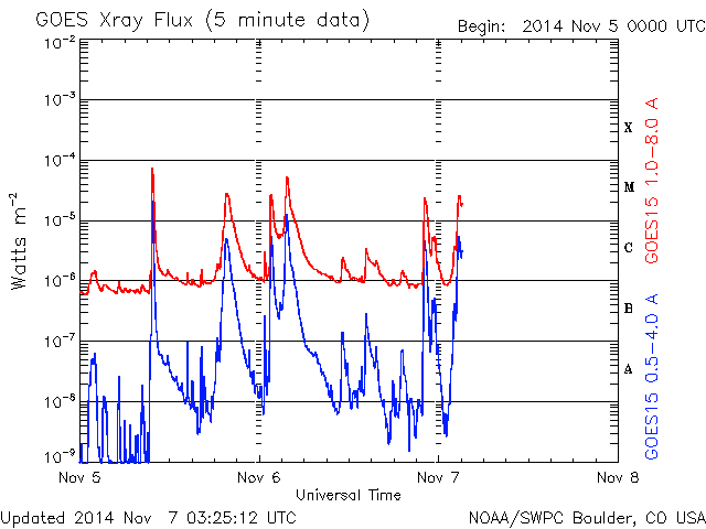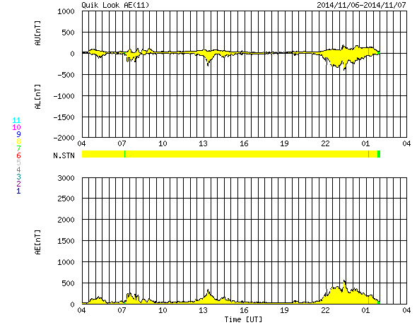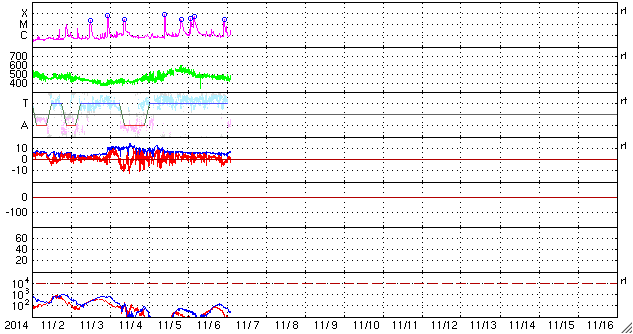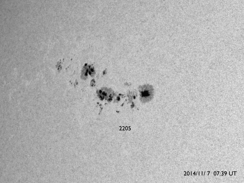 2014/11/ 7 12:29 更新 2205黒点群でMクラスフレアが2回発生しています。 2014/11/ 7 17:31 追加 SDO衛星の最新写真を掲載します。 担当 篠原 2205黒点群の活動が続いています。 今朝、7日7時(世界時6日22時)にM2.5、 そして、7日11時半(世界時7日2時半)にもM2.7の 中規模フレアが起きています。 SDO衛星の写真は、更新が止まったままなのですが、 地上のネットワークの事故が原因の様で、 復旧を待っています。 現在の黒点の様子は、 国立天文台太陽観測所の最新画像をご覧下さい。 2205黒点群は大きな姿を保っています。 太陽風は、速度が500km/秒から460km/秒へ ゆっくりと下がり、やや高速の状態です。 磁場強度は、6nTと平均的な値で安定しています。 磁場の南北成分は、北寄りの時間帯が長く、 グラフの後半で南にも振れています。 AE指数もそれに対応して、 中盤までは小さい変化が見られる程度ですが、 後半に500nT近い変化が発生しています。 太陽風は次第に穏やかになりそうです。 2014/11/ 7 17:31 追加 (篠原) 関連の図はページの最後にあります SDO衛星の写真が更新されたので、 2205黒点群の拡大写真など、現在の状況を掲載します。 SDO衛星AIA193の写真では、 南半球の高緯度域でコロナホールが大きく広がっています。 前周期よりも低緯度側へ伸びているので、 今後の太陽風は、前周期より強まるかもしれません。