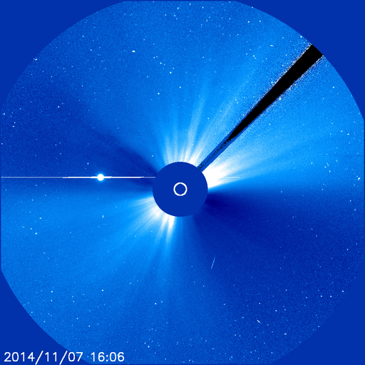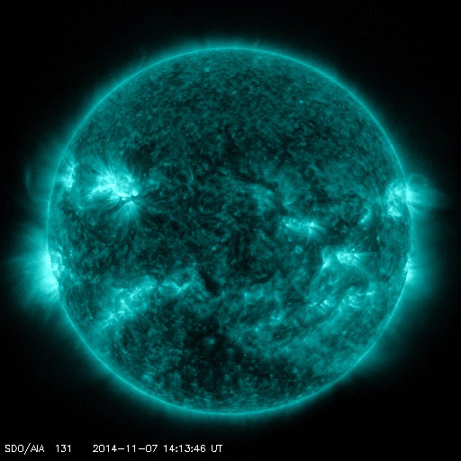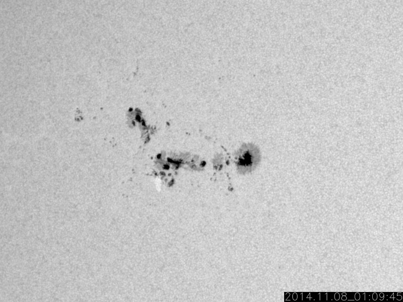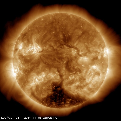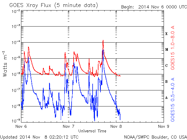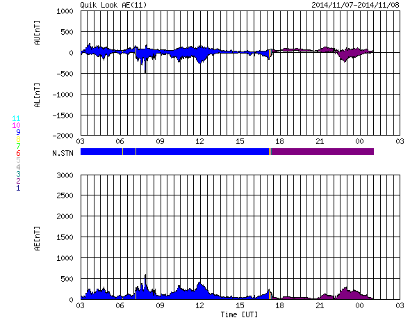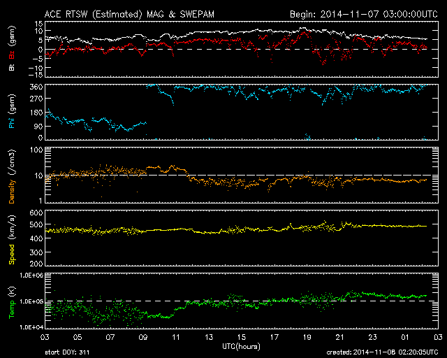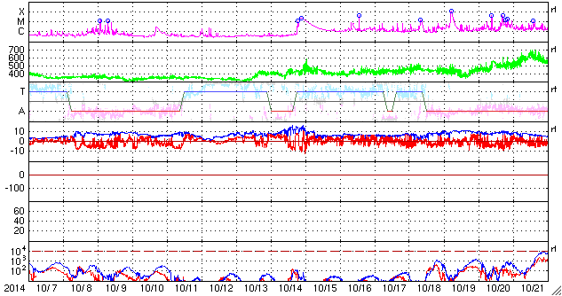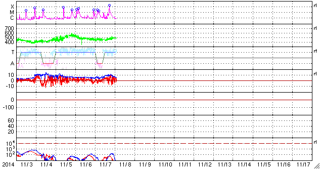2014/11/ 8 11:20 更新 2205黒点群でX1.6の大規模フレアが発生しました。CMEも発生しています。 担当 篠原 深夜、8日2時(世界時7日17時)に2205黒点群で、 X1.6の大規模フレアが発生しました。 SDO衛星AIA131、193による動画を掲載します。 2205黒点群は、昨日のニュース以降も、 M2.0、M1.0、C7.0、C7.0と 中・小規模のフレアを起こし続け、 とうとうXクラスに達する変化を起こしました。 このフレアに伴って、 CME(太陽ガスの放出現象)も発生しています。 黒点群は地球から見ると斜めの位置ですが、 SOHO衛星LASCO C3の動画では、 噴出したCMEは地球の方向にも向かっている様です。 到来まで2〜3日程度と考えると、 明日、9日の夜から、10日の夜にかけて 太陽風の乱れがやって来る可能性があります。 前回の2192黒点群の活動では、 目立ったCMEの発生はなかったので、 久しぶりに突発性の乱れがやって来るかもしれません。 太陽風は、磁場強度が5nTから10nTに上がり、 再び5nTに下がる変化をしています。 それとともに、速度が500km/秒に上がり、 太陽風の弱い高まりが来ている様です。 一方、SDO衛星AIA193の太陽コロナ写真では、 南半球の高緯度寄りにコロナホールが大きく広がっていて、 今後、この領域の影響も到来するかもしれません。 タイミングがCMEと重なるので、 変化の様子が分かりにくくなりそうです。 磁場の南北成分は、比較的北寄りに推移していますが、 磁気圏では小さい活動が度々起きていて、 AE指数のグラフでは、 300nTくらいの変化が何度も起きています。