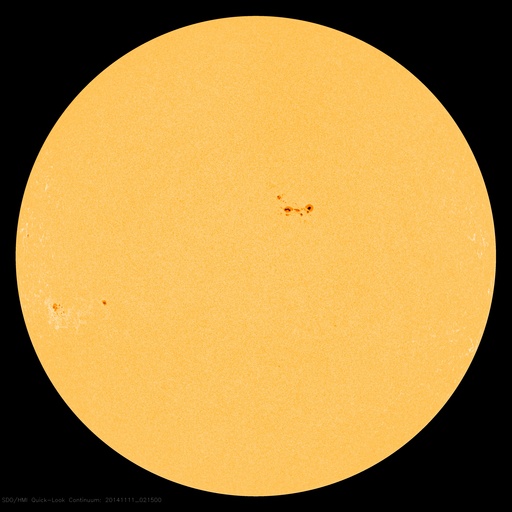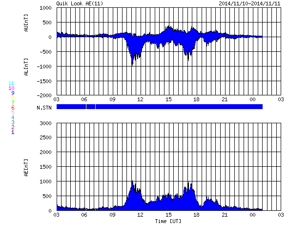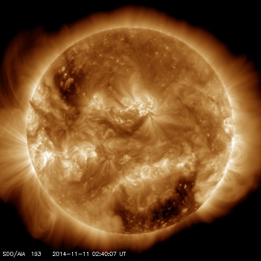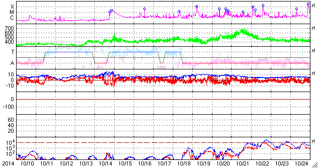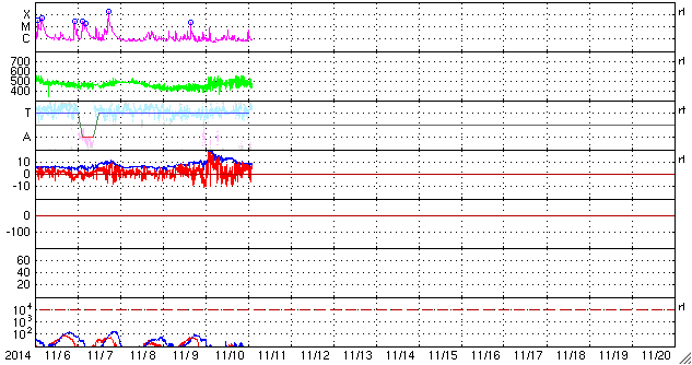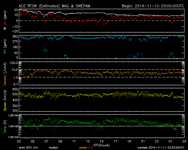 2014/11/11 11:54 更新 太陽風磁場の強まりは、下がりかけています。2205黒点群はCフレアが続いています。 担当 篠原 太陽風の磁場強度は、 20nT近くからゆっくりと下がっていますが、 現在も10nTと強まった状態です。 速度も、450〜500km/秒とやや高速の状態から、 今朝くらいからは低下の傾向が見えて、 現在は450km/秒くらいに落ち着いています。 太陽風の強まりは、弱まりつつある様です。 ACEのデータでは、 昨日のニュース以降、目立った変化は起きていないので、 CMEによる乱れは、 今回の変化の中に含まれていたのかもしれません。 磁場の南北成分は、 ACEの図の初めと終わりは北寄りですが、 中盤に0nT付近で変化する時間帯があります。 この頃に磁気圏の活動も高まっていて、 AE指数は、1000nTに達する大きな変化が記録されています。 極域ではにきやかなオーロラの活動が 見られたのではないでしょうか。 現在は磁場が北を向いているため、 磁気圏の活動は穏やかですが、 磁場強度は高まったままなので、 再び南寄りに傾向が変わると、 磁気圏の活動も強まる可能性があります。 2205黒点群は、昨日のニュースの時のC7.6以降も Cクラスのフレアを起こしています。 C5.0、C3.6やC1台のフレアが4回記録されています。 2205黒点群の2日間の変化を、可視光写真の動画で紹介します。 黒点は複雑な変化を続けています。 この後もフレアの発生に注目してください。 ![]() 2205黒点群の2日間の変化。SDO衛星。 (c) SDO (NASA)、 (動画加工 : 宇宙天気ニュース) ![]() SDO衛星のAIA193カメラによる太陽コロナの様子 (c) SDO (NASA) ![]() SDO衛星による太陽の可視光写真。マウスの矢印を写真に重ねると、黒点番号付きの写真に切り替わります。 (c) SDO (NASA) ![]() ACEが観測した太陽風の磁場(1番上の枠、白線は全体の強度、赤線は南北成分) および、太陽風の密度(3番目の橙線)、速度(4番目の黄線) (c) NOAA/SWPC ![]() リアルタイムAE指数 下段のAEグラフの値が高くなると、オーロラ活動が活発化しています。 (c) 京都大学, NICT ![]() 27日の太陽周期に合わせたデータプロット 太陽が同じ面を地球に向けていた27日前の変化から、今後を予想することができます。 (c) 作図:宇宙天気ニュース