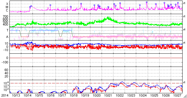 (c) SOHO (ESA & NASA) ![]() SDO衛星による太陽の可視光写真。マウスの矢印を写真に重ねると、黒点番号付きの写真に切り替わります。 (c) SDO (NASA) ![]() GOES衛星の太陽X線データ (c) NOAA/SWPC ![]() ACEが観測した太陽風の磁場(1番上の枠、白線は全体の強度、赤線は南北成分) および、太陽風の密度(3番目の橙線)、速度(4番目の黄線) (c) NOAA/SWPC ![]() リアルタイムAE指数 下段のAEグラフの値が高くなると、オーロラ活動が活発化しています。 (c) 京都大学, NICT ![]() 27日の太陽周期に合わせたデータプロット 太陽が同じ面を地球に向けていた27日前の変化から、今後を予想することができます。 (c) 作図:宇宙天気ニュース