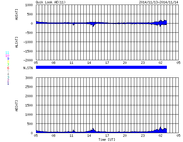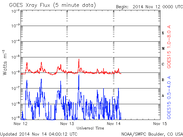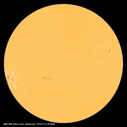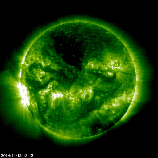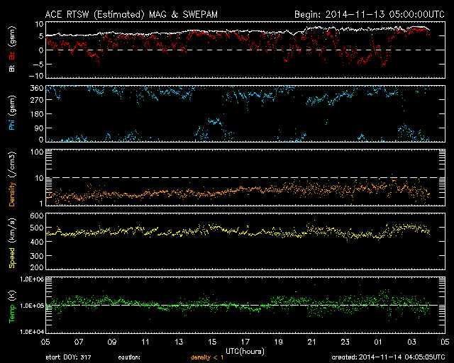 2014/11/14 13:04 更新 2209黒点群は更に広がりを見せています。太陽風はやや高速です。 担当 篠原 2209黒点群は、更に新しい黒点が見え始めています。 昨日の写真で見えていたのは、 右側の2つくらいでしたが、 その向こうからより大きな黒点が見え始めています。 2209群のフレア活動は、 13日15時(世界時13日6時)にC8.4と、 14日4時(世界時13日19時)にC1.9の 小規模フレアが観測されています。 今のところ、特に活発に活動している様子ではありません。 現在の太陽風は、速度が470〜500km/秒と 高めの状態が続いています。 磁場強度は再び高まっていて、 5nTから8nTへ変化しています。 27日周期の図を見ると、 前周期も太陽風の速度は450km/秒とやや高めでした。 この状態が続いているのかもしれません。 すると、そろそろセクターの切り替わりが見られる 可能性があります。 今日はSDO衛星のページにアクセスすることができず、 太陽のコロナ写真として、 SOHO衛星のEIT195を掲載します。 やや見にくいですが、 北半球側の中央部にコロナホールが広がっています。 27日前の前周期の写真と比べると、 中緯度域に広がりがまとまった様に見えます。 前周期の太陽風は、 10月21日に600km/秒に達する高速風が到来しています。 今回も、明後日、16日頃から 一段と速度の高まりが始まるかもしれません。