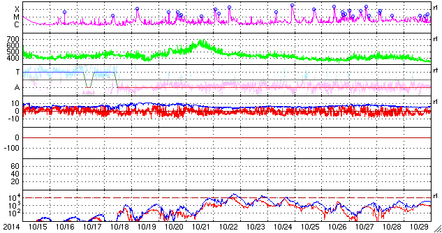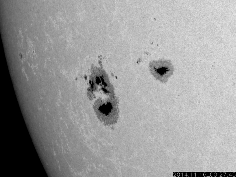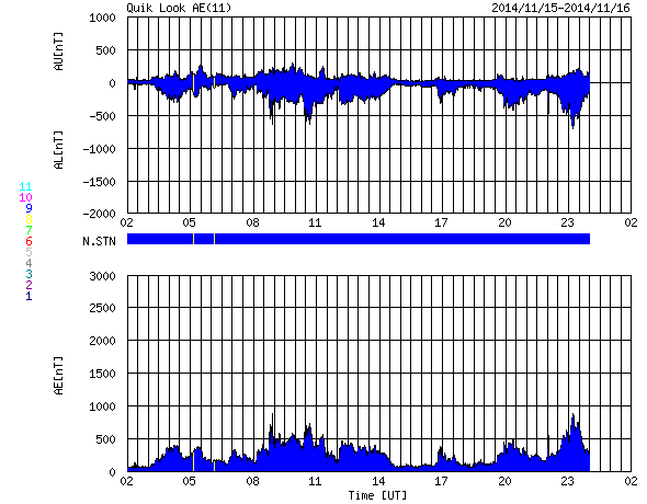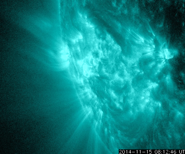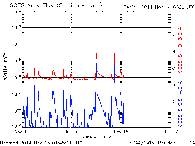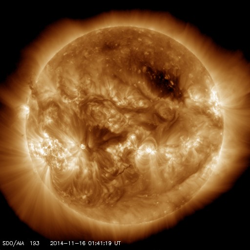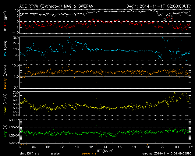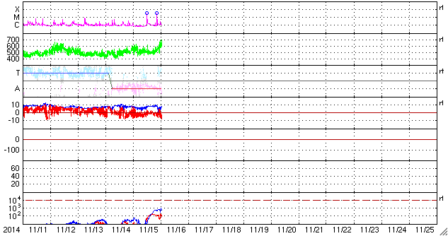 2014/11/16 10:49 更新 2209黒点群で中規模フレアが発生しました。高速の太陽風が続いています。 担当 篠原 2209黒点群で、昨夜、15日21時(世界時15日12時)にM3.2、 今朝、16日5時半(世界時15日20時半)にM3.7と、 2つの中規模フレアが発生しました。 2209黒点群の活動度が上がっている様です。 NOAAの黒点群情報では、 磁場構造もより複雑になっていて、 更に大きなフレアの可能性もある様です。 引き続き注目して下さい。 太陽風は、速度が500km/秒台から600km/秒台へ 上がろうとしています。 ACEのグラフの最後は、600〜650km/秒に達しています。 磁場強度はやや強まったままで、 6nTから9nTの間を変化しています。 27日周期の図の前周期で、 速度が上がり始めたのは10月20日頃で、 一周期後はちょうど今日辺りに相当します。 SDO衛星AIA193のコロナ写真でも、 北半球のコロナホールは西側に半分ほど進んでいて、 影響が強まる目安の位置に達しています。 太陽風の速度はもう一段上昇するかもしれません。 セクターの切り替わり以降、 磁場の南北成分は、南寄りの傾向が続けています。 このため、磁気圏の活動度も高まっていて、 AE指数は500nT前後の小中規模の変化が 繰り返し発生しています。 極域ではオーロラがきれいに見えているのではないでしょうか。 高速風は、これから3日くらい続きそうです。 北極域のライブカメラで観望するチャンスだと思います。 ![]() 2209黒点群で発生した、M3.2、M3.7フレア。SDO衛星AIA131。 (c) SDO (NASA)、 (動画加工 : 宇宙天気ニュース) ![]() 2209黒点群の拡大写真。SDO衛星。 (c) SDO (NASA) ![]() SDO衛星のAIA193カメラによる太陽コロナの様子 (c) SDO (NASA) ![]() SDO衛星による太陽の可視光写真。マウスの矢印を写真に重ねると、黒点番号付きの写真に切り替わります。 (c) SDO (NASA) ![]() GOES衛星の太陽X線データ (c) NOAA/SWPC ![]() ACEが観測した太陽風の磁場(1番上の枠、白線は全体の強度、赤線は南北成分) および、太陽風の密度(3番目の橙線)、速度(4番目の黄線) (c) NOAA/SWPC ![]() リアルタイムAE指数 下段のAEグラフの値が高くなると、オーロラ活動が活発化しています。 (c) 京都大学, NICT ![]() 27日の太陽周期に合わせたデータプロット 太陽が同じ面を地球に向けていた27日前の変化から、今後を予想することができます。 (c) 作図:宇宙天気ニュース