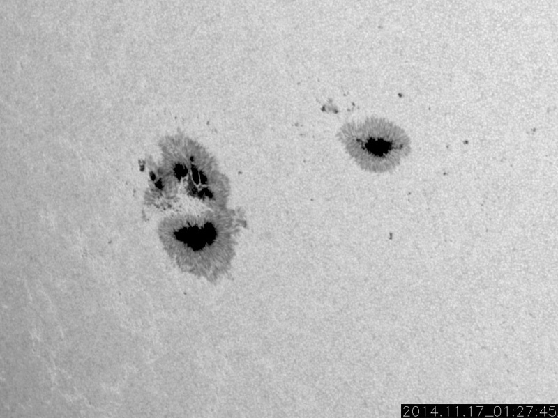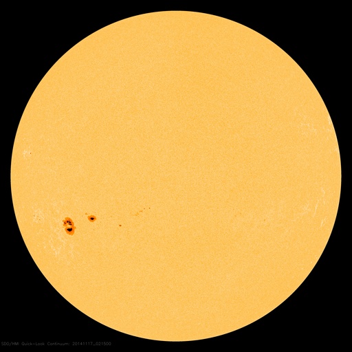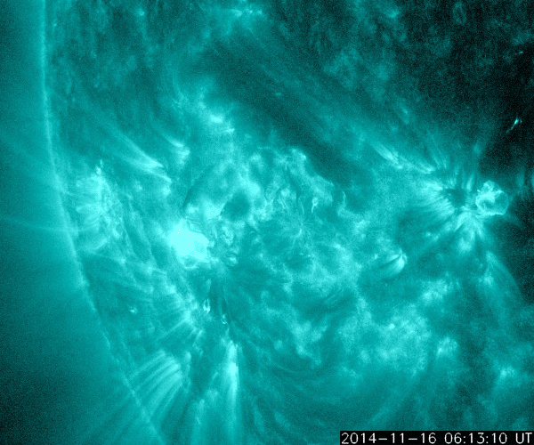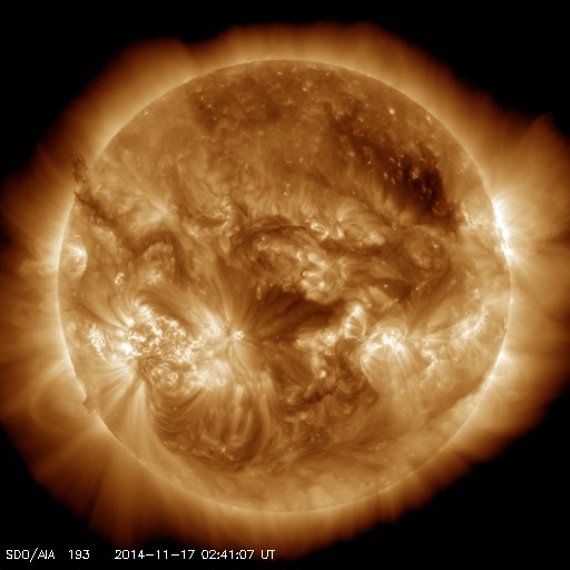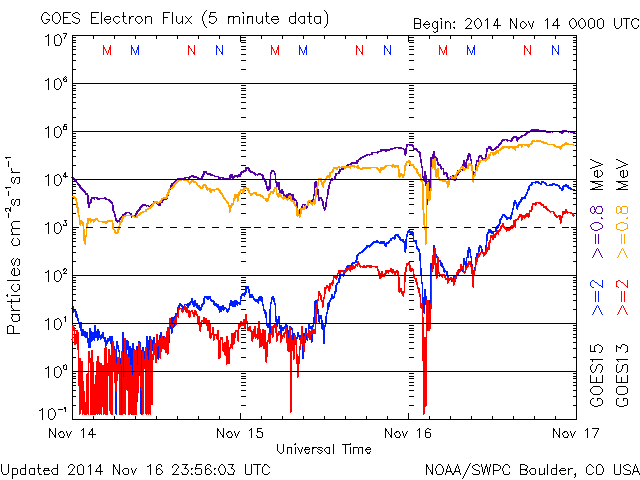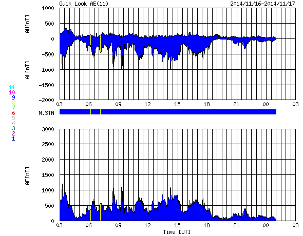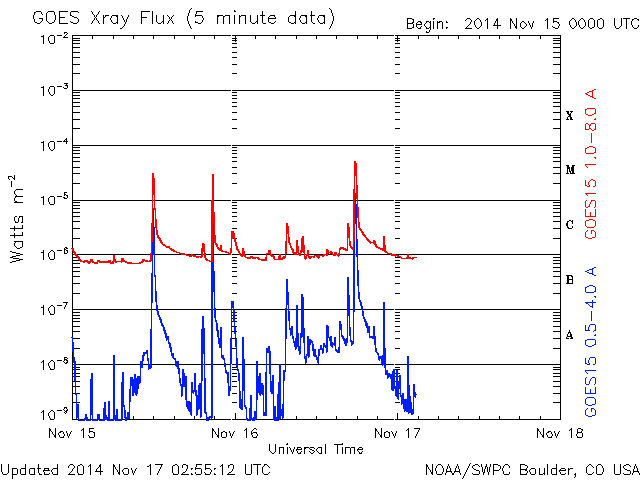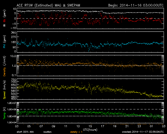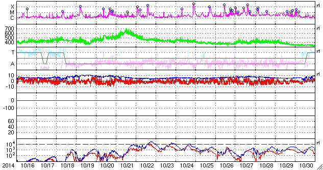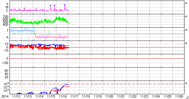 2014/11/17 11:56 更新 M5.7の中規模フレアが発生しました。太陽風の速度は下がり始めています。 担当 篠原 2209黒点群の活動が続いています。 昨日の夕方くらいから、 C3.9、C2.0、C2.4、C1.5、C3.9と 小規模フレアが続く様になり、 深夜、17日2時半(世界時16日17時半)に、 M5.7と更に大きい規模の中規模フレアを起こしました。 可視光写真では、黒点の規模は保たれています。 磁場構造の複雑さも続いていて、 引き続き、フレアの発生に注意して下さい。 太陽風は、昨日いっぱい600km/秒台の高速風が続きましたが、 その後、速度の低下が始まって、今朝には450km/秒と、 やや高速の状態にまで下がっています。 27日周期の図では、前周期10月21日の高速風が ちょうど1日早まった様な変化になっています。 太陽風の磁場強度は、 5nTと平均的な値に下がって安定しています。 SDO衛星AIA193のコロナホールの位置からは、 もうしばらく高速風が続きそうだったのですが、 速度の高まりはここまでになるのでしょうか。 磁気圏の活動は活発な状態が続いていました。 AE指数は、500nTから1000nTに達する変動が 頻繁に発生しています。 しかし、太陽風の磁場強度が下がった頃から、 南向きの変化が小さくなり、 AE指数の変化は、後半から弱くなっています。 活動の傾向が変わるのかもしれません。 太陽風の高まりを受けて、 放射線帯の高エネルギー電子が増加しています。 GOES15(青線)は10,000のレベルにほぼ達しています。 現在は太陽風が弱まりかけているので、 更に大きく上昇することはなさそうです。
