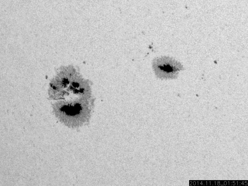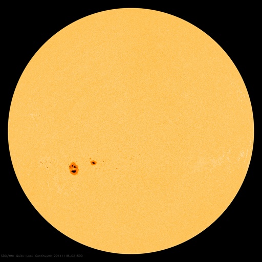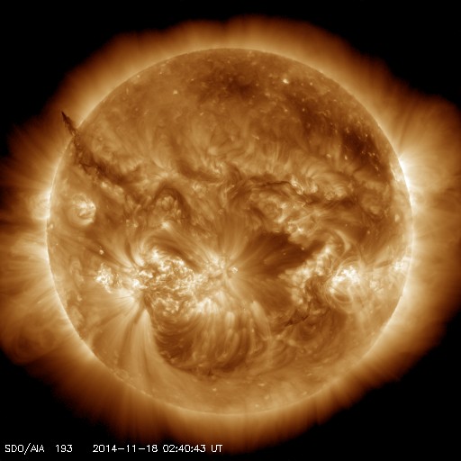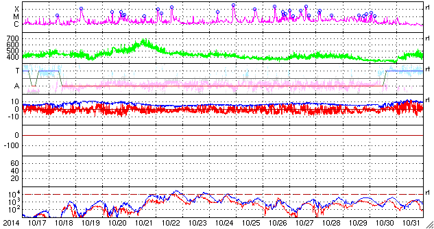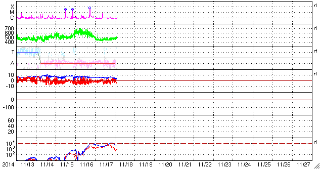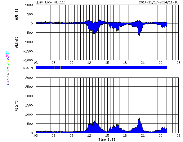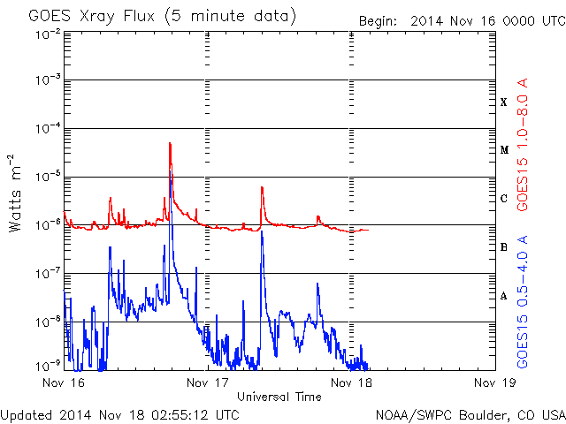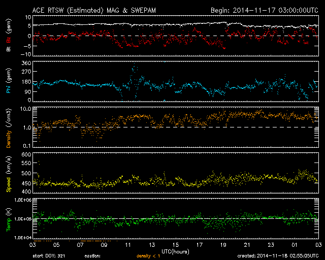 2014/11/18 11:55 更新 2209群のフレア活動は弱まっています。太陽風はやや高速です。 担当 篠原 2209黒点群は、 昨日お知らせしたM5.7フレア以降、 C1〜2の小さいフレアを3回起こした程度で、 フレア活動が弱まっています。 このまま静かになるのか、一休みして再び高まるのか、 しばらく注目して下さい。 X線のグラフでは、 17日18時(世界時17日9時)に C6.5の小規模フレアが発生しています。 発生地点は、西の端に没した2205黒点群です。 太陽風は、 450km/秒に下がった速度が480km/秒にまた少し上がり、 やや高速の状態が続いています。 磁場強度は5nTと平均的な値で安定しています。 磁場の南北成分は、グラフの中央で南寄りになり、 この影響で、AE指数は500〜800nTの中規模の変化が 3回発生しています。 現在の太陽風磁場は、 0nTをはさんで南北に小さく振れています。 磁気圏の活動は、規模は小さくなりそうですが、 ある程度高まった状態が続くかもしれません。 SDO衛星AIA193を見ると、 北半球のコロナホールは、 太陽の西の端に近づいています。 影響は次第に弱まって、 太陽風は低速の風に変わっていくでしょう。