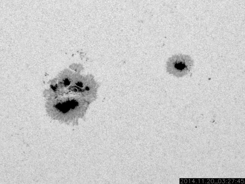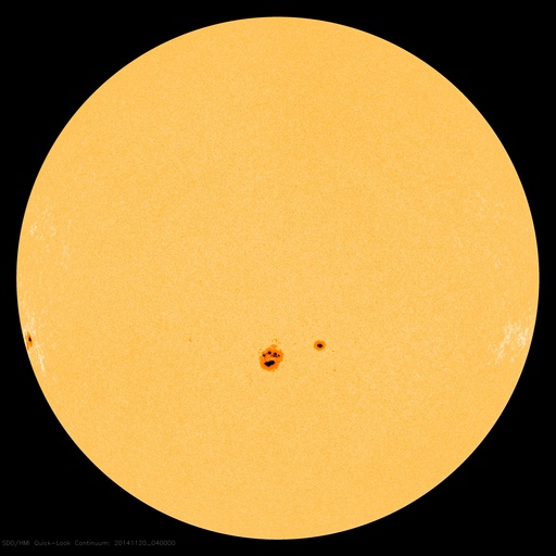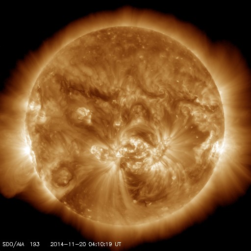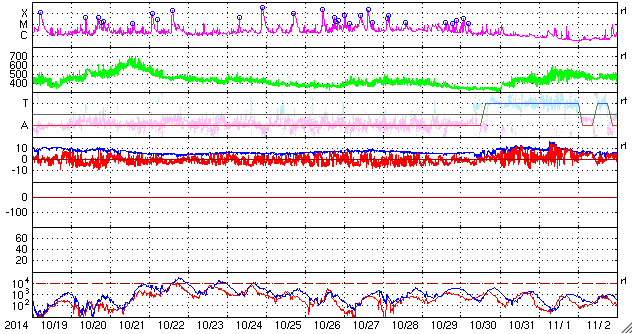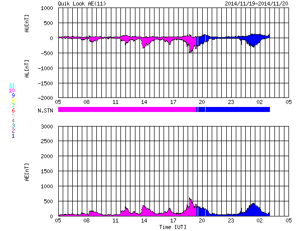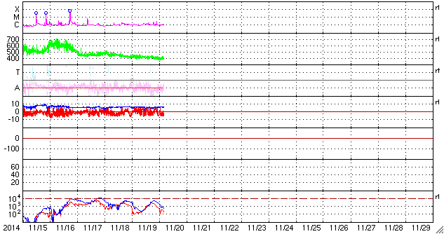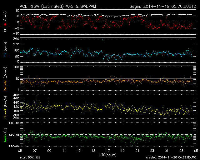 2014/11/20 13:30 更新 太陽風は平均的な状態で、磁気圏では小規模の変化が発生しています。 担当 篠原 太陽風は、速度が420km/秒から400km/秒に少し下がりましたが、 平均的な速度で安定しています。 磁場強度も、6nTと平均的な強さです。 磁場の南北成分は、南向きの時間帯が頻繁に発生しています。 このため、AE指数には300nTや500nTの小規模の変化が 時々発生しています。 太陽風が弱まって、磁気圏の変化も小さくなっていますが、 ある程度の活動は続いています。 27日周期の図では、太陽風は前周期と同様の推移をしています。 この傾向が続くのであれば、 もう5日くらい現在の様な状態が続くかもしれません。 太陽は、C2.4とC2.6の小規模フレアが2回発生した程度です。 2209黒点群は、すっかり穏やかになっています。 一方、東端(左端)から新しい黒点が姿を現しています。 GOES衛星のX線写真では、特に活動は見られず、 今のところ穏やかな領域の様です。 ![]() 2209黒点群の拡大写真。SDO衛星。 (c) SDO (NASA) ![]() SDO衛星のAIA193カメラによる太陽コロナの様子 (c) SDO (NASA) ![]() SDO衛星による太陽の可視光写真。マウスの矢印を写真に重ねると、黒点番号付きの写真に切り替わります。 (c) SDO (NASA) ![]() ACEが観測した太陽風の磁場(1番上の枠、白線は全体の強度、赤線は南北成分) および、太陽風の密度(3番目の橙線)、速度(4番目の黄線) (c) NOAA/SWPC ![]() リアルタイムAE指数 下段のAEグラフの値が高くなると、オーロラ活動が活発化しています。 (c) 京都大学, NICT ![]() 27日の太陽周期に合わせたデータプロット 太陽が同じ面を地球に向けていた27日前の変化から、今後を予想することができます。 (c) 作図:宇宙天気ニュース