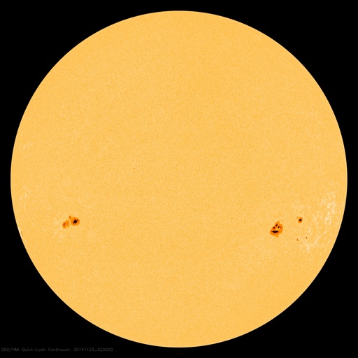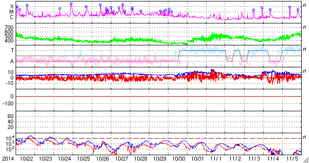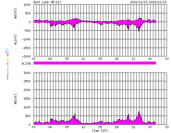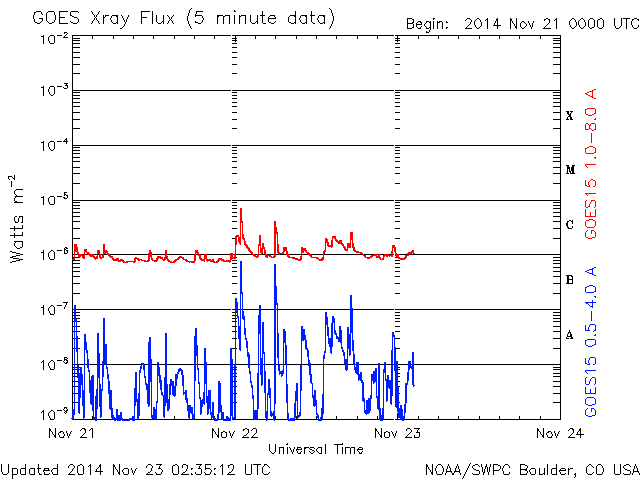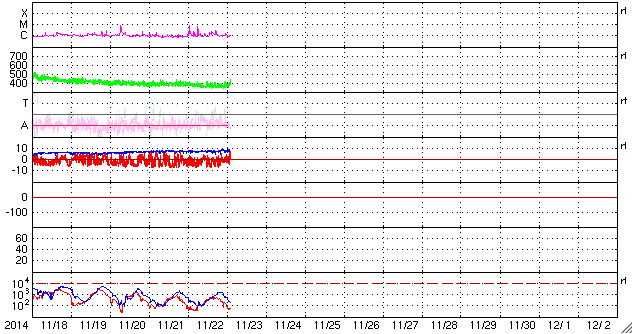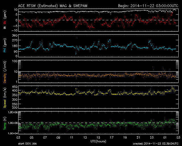 2014/11/23 11:39 更新 2209黒点群で小規模フレアが続いています。 担当 篠原 太陽風は、370km/秒とやや低速の風が続いています。 磁場強度は、8nTとやや強まっていましたが、 更に、9nTから10nT近くへ少し高まっています。 それとともに、グラフの最後では、 速度も400km/秒に上がりかけています。 磁場の南北成分は、南寄りの傾向が弱まって、 0nT付近で変化するように変わっています。 小幅ですが磁場の強まりや速度の変化が起きていることから、 今後の太陽風は様子が変わるのかもしれません。 小規模の変化に留まると思いますが、しばらく注目して下さい。 磁気圏の活動は、 AE指数500nTほどの変化が数回起きています。 変化の大きさは昨日と同程度ですが、 頻度が下がっているのは、 太陽風磁場の変化に関係しているのかもしれません。 太陽は、昨日お知らせしたC8.1のフレア以降、 南西(右下)の2209黒点群の活動が増えています。 C2.4、C6.5、C3.2、C1.5、C2.1、C3.1と、 小規模フレアが続いています。 更に強まって行くのか、この程度に留まるのか、 今後の変化に注目して下さい。