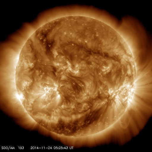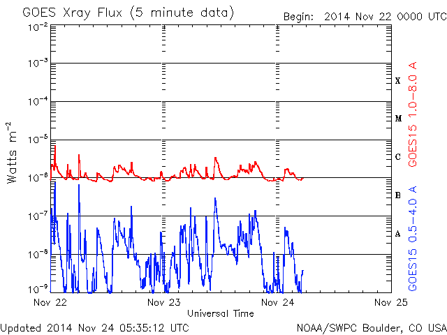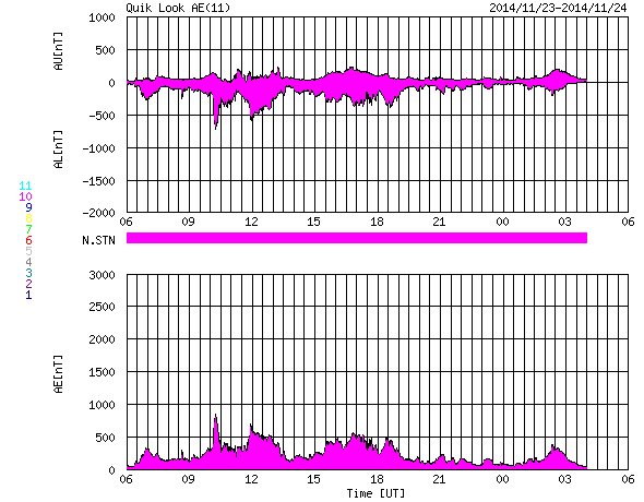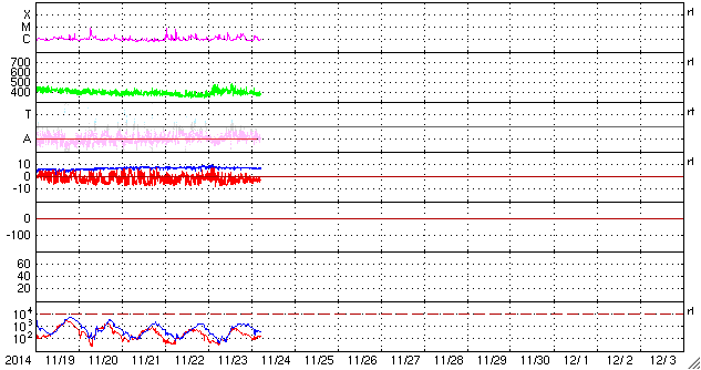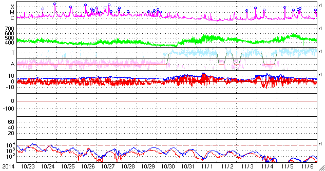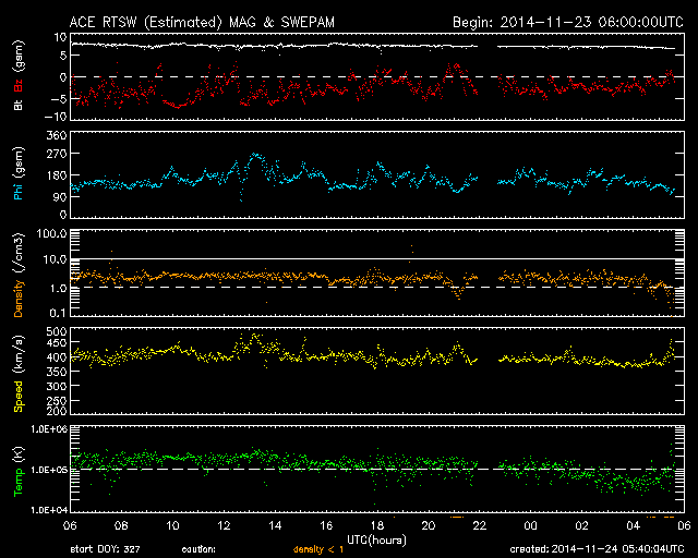2014/11/24 14:40 更新 太陽東端の2217黒点群でCクラスフレアが続いています。 担当 篠原 太陽では、C2〜3の小規模フレアが次々と発生しています。 西(右)の2209黒点群で2回、中央やや左の2216群で1回、 南東端(左下端)から現れた2217群で6回記録されています。 新しく現れた2217群の活動は強まるのかどうか、 今後の変化に注目して下さい。 また、北半球の東端からも新しい黒点が姿を現しています。 太陽風の速度は、昨日いっぱいは400km/秒台を保ちましたが、 今朝から400km/秒を切る位にやや下がっています。 磁場強度も、8nTから7nTに少し下がり気味です。 太陽風は、特に高まるほどの変化にはなりませんでした。 一方、磁場の南北成分は再び南寄りに振れる様になっています。 このため、磁気圏の活動もやや高まった状態が続いて、 AE指数は300〜600nTの小中規模の変動が頻繁に起きています。 しかし、27日周期の図の前周期の太陽風は、 10月30日のセクターの切り替わり以降北寄りに変わっていて、 この変化の回帰が明日か明後日くらいに近づいていると思われます。 その後、磁気圏の活動は小さくなる可能性があります。