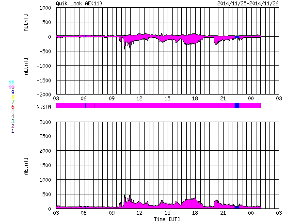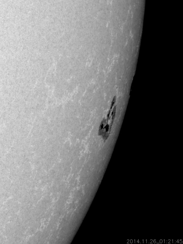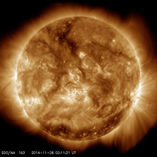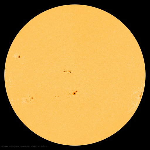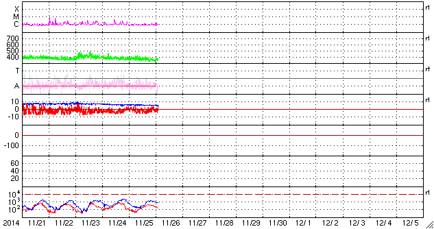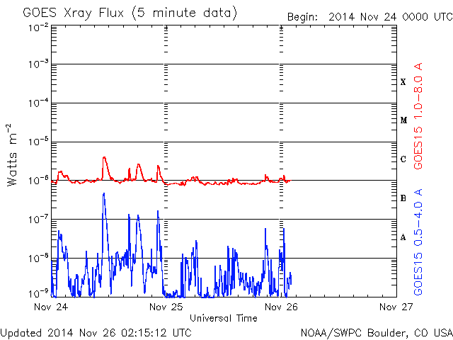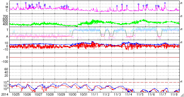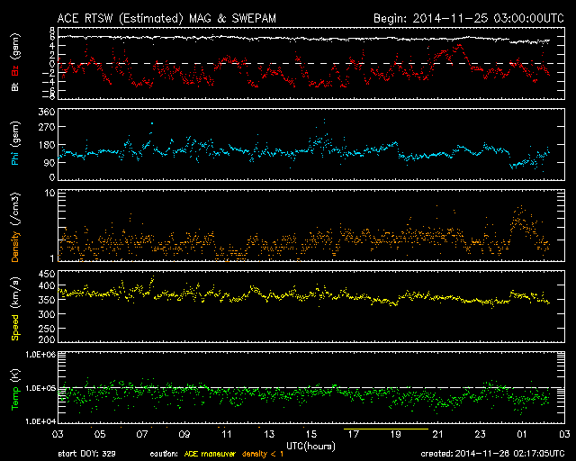 2014/11/26 11:18 更新 フレアの発生は少なくなっています。太陽風は低速風になっています。 担当 篠原 2209黒点群は、更に西の端に近づいて、 もうすぐ見えなくなります。 2週間後に再び東端に顔を見せるかどうか、 12月11、12日頃に注目して下さい。 太陽面は、この他に5つの黒点群が見えています。 にぎわっていますが、フレアの活動は少なくなっていて、 2217群と2220群、そして、東端で計3回、 C1の小さいフレアが発生した程度です。 太陽の活動は一休みでしょうか。 太陽風は、速度と磁場強度が少しずつ下がり、 速度は350km/秒と低速に、 磁場強度は5nTと平均的な値に戻っています。 磁場の南北成分は、また南寄りに振れる様になって、 AE指数で300nTと小規模ですが、 オーロラの活動はある程度続いている様です。 27日周期の図を見ると、 前周期の10月30日に到来した 太陽風磁場のセクターの切り替わりが 今日くらいに到来するかもしれません。 前周期は、その後、磁場が北寄りに変わっています。 今後の太陽風の変化に注目して下さい。 ![]() 太陽の西端に沈みつつある2209黒点群。SDO衛星。 (c) SDO (NASA) ![]() SDO衛星のAIA193カメラによる太陽コロナの様子 (c) SDO (NASA) ![]() SDO衛星による太陽の可視光写真。マウスの矢印を写真に重ねると、黒点番号付きの写真に切り替わります。 (c) SDO (NASA) ![]() GOES衛星の太陽X線データ (c) NOAA/SWPC ![]() ACEが観測した太陽風の磁場(1番上の枠、白線は全体の強度、赤線は南北成分) および、太陽風の密度(3番目の橙線)、速度(4番目の黄線) (c) NOAA/SWPC ![]() リアルタイムAE指数 下段のAEグラフの値が高くなると、オーロラ活動が活発化しています。 (c) 京都大学, NICT ![]() 27日の太陽周期に合わせたデータプロット 太陽が同じ面を地球に向けていた27日前の変化から、今後を予想することができます。 (c) 作図:宇宙天気ニュース