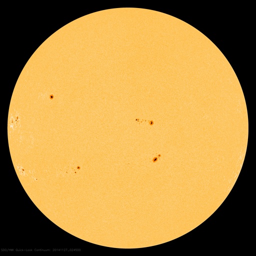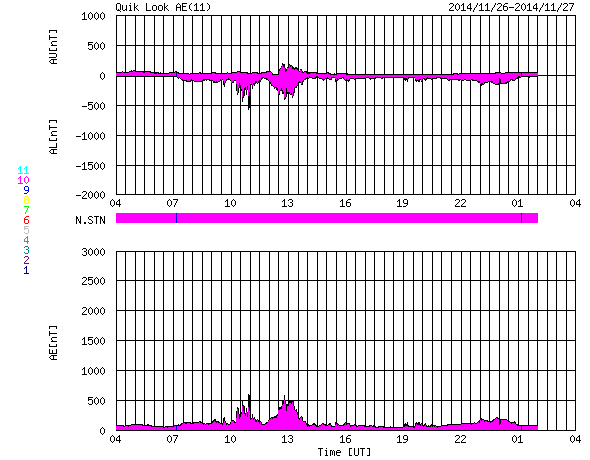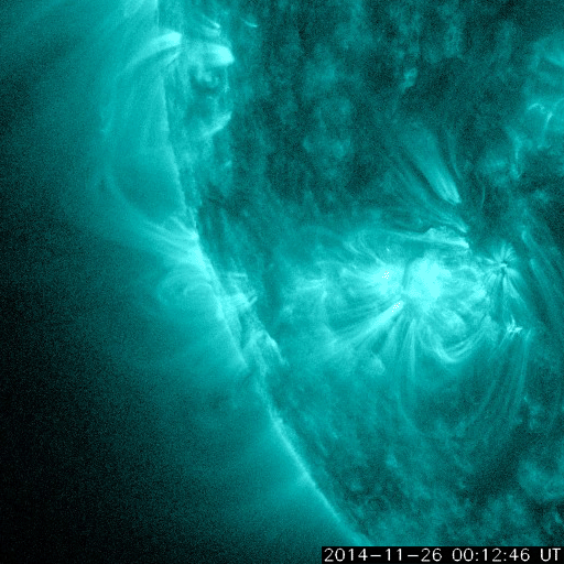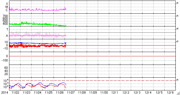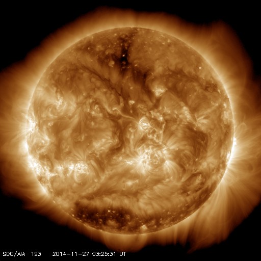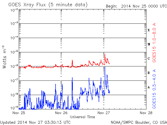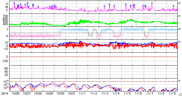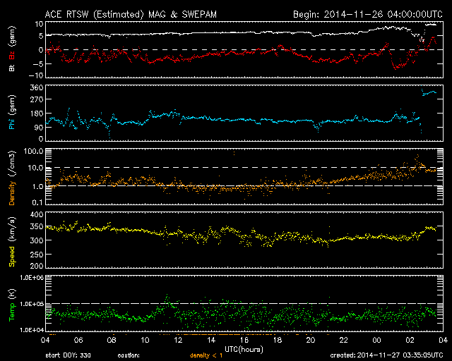 2014/11/27 12:32 更新 東端から新しい黒点群が現れています。太陽風の磁場は北寄りに変わりそうです。 担当 篠原 太陽の東端から、 南北そろって2つの黒点群が顔を出しました。 北の黒点群は2221群、南は2222群と、 それぞれ番号が付いています。 2222群は活動的で、 現れてすぐに、C2.8、C2.6、C3.2と 小規模フレアを続けて起こしています。 その様子をSDO衛星AIA131の動画で紹介します。 ただ、GOES衛星のX線グラフで、 最も大きいC8.2のフレアを起こしているのはこの群ではなく、 東端に沈んで行った2209群です。 見えなくなりかけたところで発生した現象です。 大型の黒点は沈んで行きましたが、 現在の太陽面には7つの黒点群が分布していて、 にぎやかさは続いています。 太陽風は、今日にかけて速度が350km/秒から300km/秒に下がり、 かなり遅くなっています。 ただ、先ほど一段高まって、現時点では350km/秒に戻っています。 磁場強度は、5nTと平均的な値でしたが、 今朝くらいから変化が見られ、現在は9nTに強まっています。 27日周期の図ではまだ分かりにくいですが、 セクターの切り替わりが到来した様です。 前周期と比べると、半日ほど遅れています。 それとともに、磁場の南北成分は、 南寄りから北向きに変わっています。 この傾向が続くのであれば、 磁気圏の活動は、今後弱まるでしょう。 SDO衛星AIA193の太陽コロナ写真では、 北半球側の斜めに伸びる細長いコロナホールは、 前周期よりも目立たなくなっています。 前周期は、速度が500km/秒に高まる変化も 見られた(11月1日)のですが、 今回は、その変化は小さくなるかもしれません。