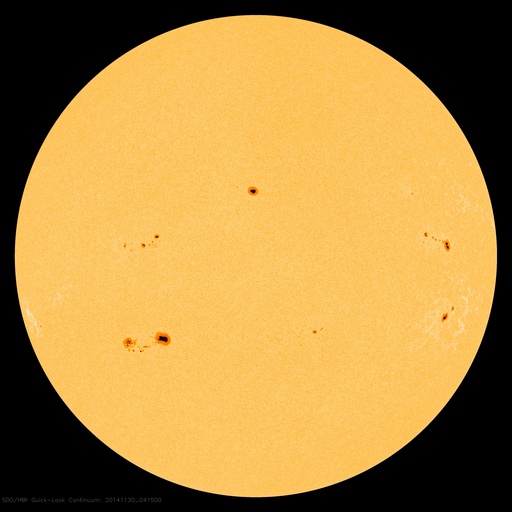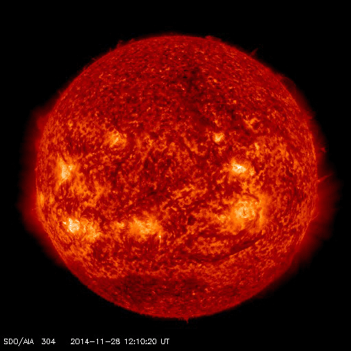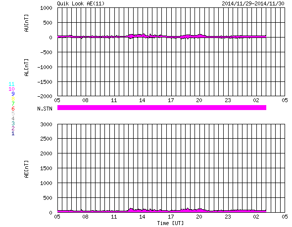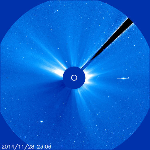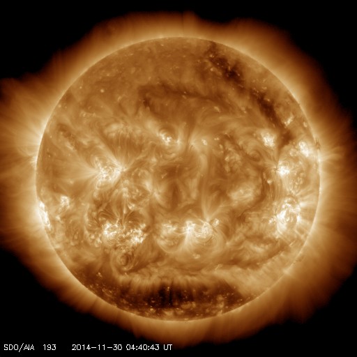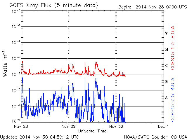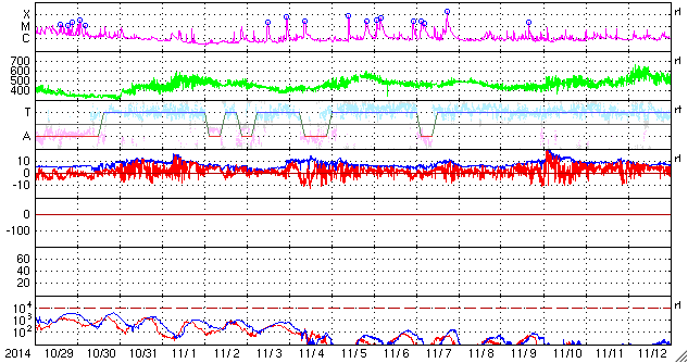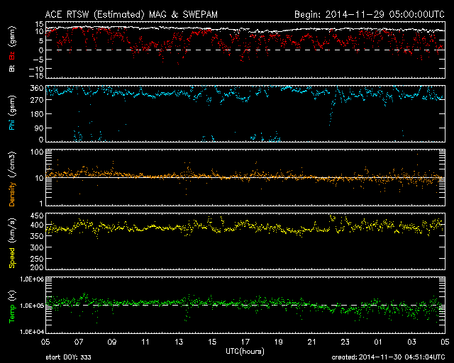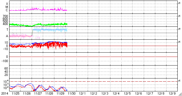 2014/11/30 13:51 更新 フィラメント噴出により弱いCMEが発生しています。磁気圏は静穏です。 担当 篠原 太陽のフレア活動は続いています。 南東(左下)の2222黒点群で、C6.7、C4.0、C3.8と 中くらいのCクラスフレアが続き、 西端(右端)に近い2219群でも、 C1.6、C2.1、C1.2、C1.7、C6.5と Cクラスフレアが活発に起きています。 また、29日6時(世界時28日21時)頃に、 北半球側の中央部と東端でフィラメント噴出が発生し、 CME(太陽ガスの放出現象)も起きています。 それぞれ、SDO衛星AIA304の動画と、 SOHO衛星LASCO C3の動画を掲載します。 ひとつは北寄りの中央部で起きているので、 地球へ影響がやって来る可能性があります。 到来まで4日程度と考えると、12月3日頃でしょうか。 磁場の強まりが運ばれてきて、南向きに大きく振れると、 磁気圏の活動を強める可能性があります。 噴出の様子から、小規模の変化に留まりそうですが、 注目して下さい。 太陽風は、370〜400km/秒と やや低速の状態で推移しています。 磁場強度は、12nTから10nTへ少し下がっていますが、 強まった状態は続いています。 磁場の南北成分は北寄りの状態が続いていて、 磁気圏の活動は穏やかです。 AE指数はほとんど変化していません。 ![]() 太陽の北半球側で発生したフィラメント噴出。 (c) SDO (NASA)、 (動画加工 : 宇宙天気ニュース) ![]() フィラメント噴出によるCMEの様子。 (c) SOHO (ESA & NASA)、 (動画加工 : 宇宙天気ニュース) ![]() SDO衛星のAIA193カメラによる太陽コロナの様子 (c) SDO (NASA) ![]() SDO衛星による太陽の可視光写真。マウスの矢印を写真に重ねると、黒点番号付きの写真に切り替わります。 (c) SDO (NASA) ![]() GOES衛星の太陽X線データ (c) NOAA/SWPC ![]() ACEが観測した太陽風の磁場(1番上の枠、白線は全体の強度、赤線は南北成分) および、太陽風の密度(3番目の橙線)、速度(4番目の黄線) (c) NOAA/SWPC ![]() リアルタイムAE指数 下段のAEグラフの値が高くなると、オーロラ活動が活発化しています。 (c) 京都大学, NICT ![]() 27日の太陽周期に合わせたデータプロット 太陽が同じ面を地球に向けていた27日前の変化から、今後を予想することができます。 (c) 作図:宇宙天気ニュース