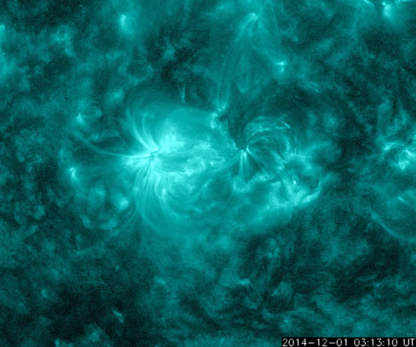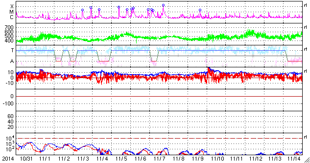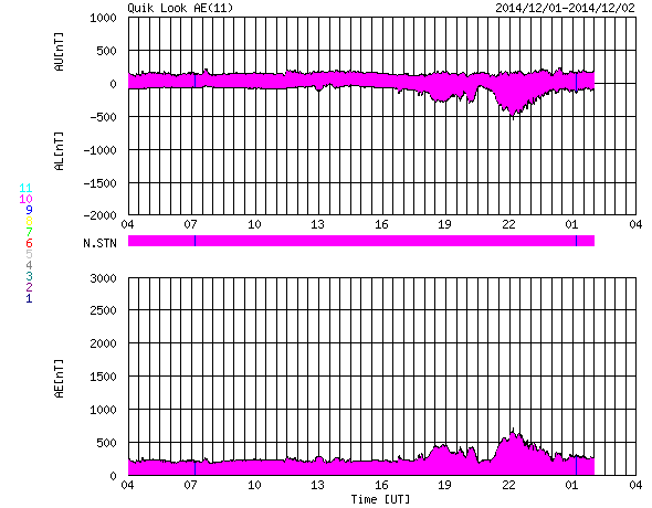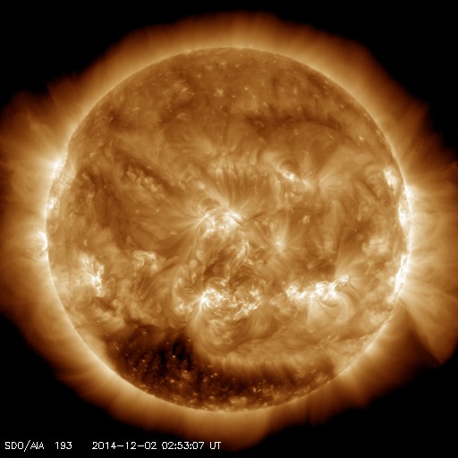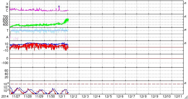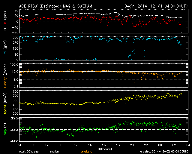 2014/12/ 2 12:04 更新 太陽風は600km/秒の高速風に変わっています。 担当 篠原 昨夜より、太陽風の速度が上昇を始め、 400km/秒から600km/秒に上がり、高速状態に変わっています。 SDO衛星AIA193のコロナ写真を見ると、 太陽の南半球の高緯度域にコロナホールが広がっています。 緯度が高いので影響は小さいと考えていたのですが、 立派な高速太陽風がやって来ました。 コロナホールは、太陽の東側(左側)にかけて より低緯度に向かって広がっています。 これからしばらく太陽風は強まった状態になるかもしれません。 一方、10nTに強まっていた太陽風の磁場強度は、 速度が上がるのと反対に低下して、 現在は5nTと平均的な値に戻っています。 南北成分は、0nTをはさんで南北に変化するように変わり、 磁気圏の活動もやや高まっています。 AE指数のグラフは、中盤までは静かですが、 後半に500nT程度の変化をしています。 太陽風の速度が高まっているので、 磁場が南に振れると、 オーロラの活動も強まりやすくなっています。 太陽では、昨日、1日15時半(世界時1日6時半)に、 中央部の2222黒点群でM1.8の中規模フレアが発生しました。 しかし、その後は2222群でのフレアの発生はなく、 2217群のC1.8と2216群のC1.2が起きた程度で、 今のところ、太陽の活動が強まっているという 状況ではありません。