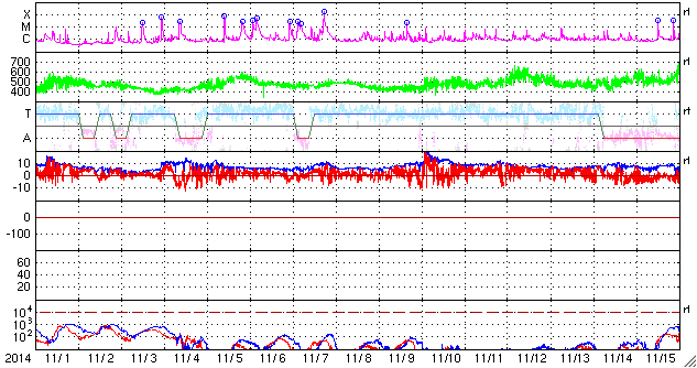 - 2014/11/30 13:51 フィラメント噴出により弱いCMEが発生しています。磁気圏は静穏です。