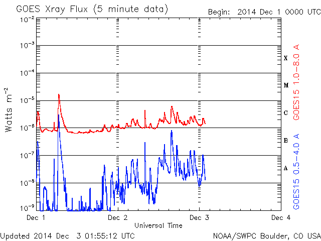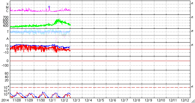 - 2014/12/ 1 12:12 フレアの発生は弱まっています。太陽風磁場の強まりは続いています。