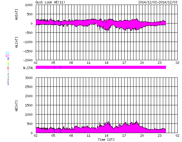 下段のAEグラフの値が高くなると、オーロラ活動が活発化しています。