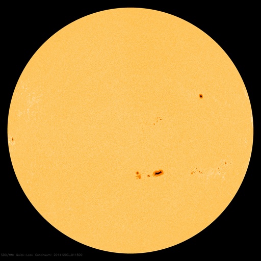 SDO衛星による太陽の可視光写真。マウスの矢印を写真に重ねると、黒点番号付きの写真に切り替わります。
