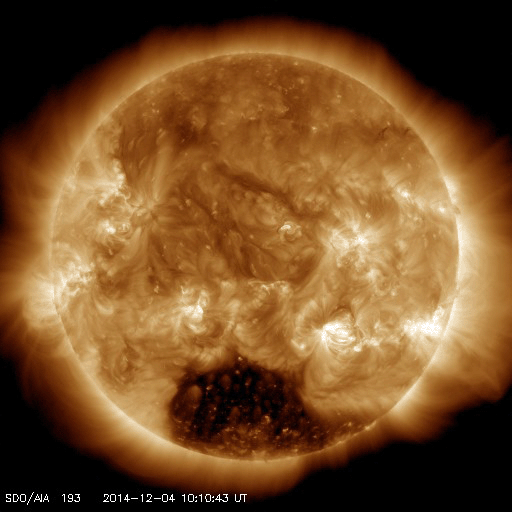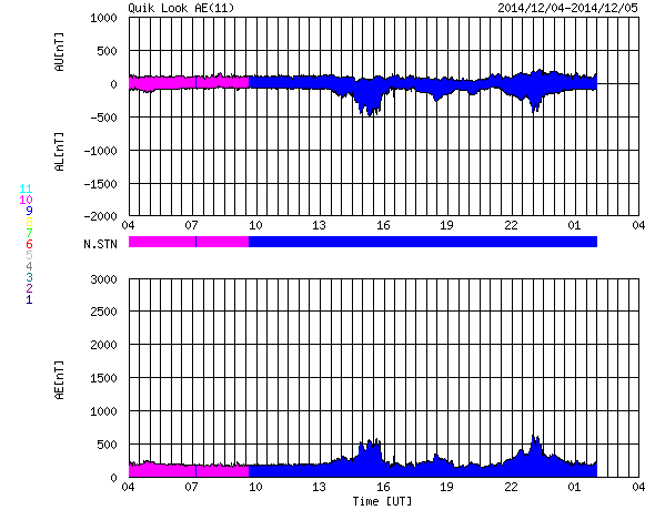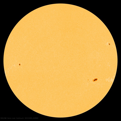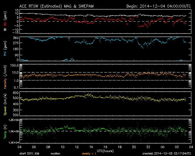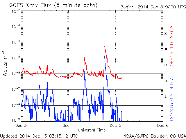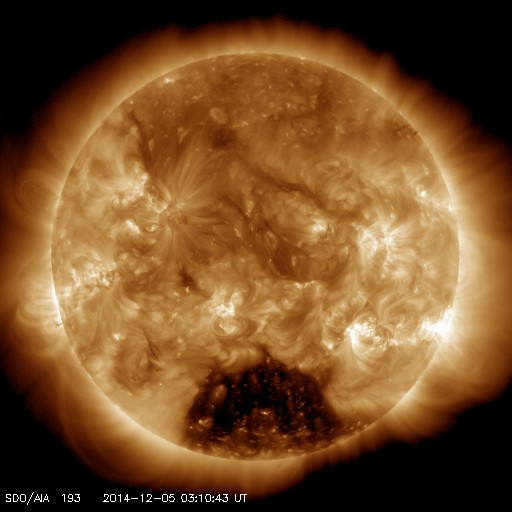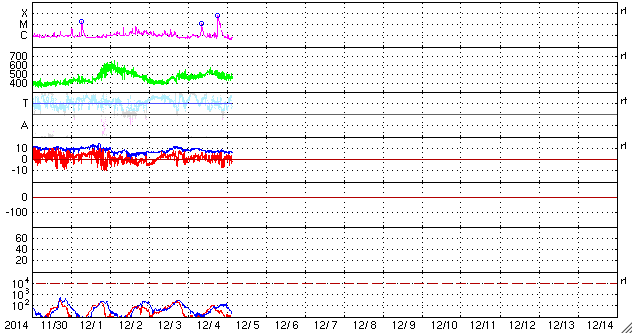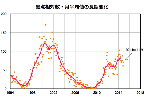 2014/12/ 5 12:18 更新 2222黒点群でM6.1など中規模フレアが3回起きました。11月の黒点数は70.1でした。 担当 篠原 WDC-SILSOより、 2014年11月の黒点総対数は 70.1 と発表されました。 10月の 60.6 より少し上がりましたが、 長期的に見ると、この1年ほどの低下傾向に沿った変化です。 太陽活動は、ゆっくりと極小期へ向かっています。 静かになりかけていた2222黒点群で、 Mクラスの中規模フレアが3回発生しました。 昨日の夕方、4日17時(世界時4日8時)にM1.3、 今日未明、5日3時(世界時4位置18時)に最大のM6.1、 その直後、5日4時半(世界時4位置19時半)にM1.3です。 M6.1フレアの様子を、 SDO衛星AIA193と131の動画で紹介します。 太陽の南西部(右下)で、激しい爆発が発生しています この動画では、 AIA193(茶色の写真)の南半球にも注目して下さい。 コロナホールがぽっかりと広がっている様子が 立体的に感じられます。 SOHO衛星のLASCOカメラによると、 目立ったCMEの噴出は起きていないようです。 2222黒点群は、 その後はC1.1の小さいフレアを起こした程度です。 どの様な活動度なのか、引き続き注目して下さい。 太陽風は、480〜500km/秒と高速の風が続いています。 磁場強度は、10nTから7nTに少し下がっています。 磁場の南北成分は、やや北寄りに推移していますが、 グラフの後半で南に振れることも多くなり、 AE指数は、小規模の変化が時々発生しています。 SDO衛星AIA193のコロナ写真で見られる様に、 南半球のコロナホールの影響は、更に強まりそうです。 太陽風は、来週にかけて高速状態が続きそうです。 ![]() 太陽黒点相対数の長期変化。 (c) 黒点データ:WDC-SILSO、作図:宇宙天気ニュース ![]() 2222黒点群で発生した、M6.1の中規模フレア。SDO衛星AIA193、131。 (c) SDO (NASA)、 (動画加工 : 宇宙天気ニュース) ![]() SDO衛星のAIA193カメラによる太陽コロナの様子 (c) SDO (NASA) ![]() SDO衛星による太陽の可視光写真。マウスの矢印を写真に重ねると、黒点番号付きの写真に切り替わります。 (c) SDO (NASA) ![]() GOES衛星の太陽X線データ (c) NOAA/SWPC ![]() ACEが観測した太陽風の磁場(1番上の枠、白線は全体の強度、赤線は南北成分) および、太陽風の密度(3番目の橙線)、速度(4番目の黄線) (c) NOAA/SWPC ![]() リアルタイムAE指数 下段のAEグラフの値が高くなると、オーロラ活動が活発化しています。 (c) 京都大学, NICT ![]() 27日の太陽周期に合わせたデータプロット 太陽が同じ面を地球に向けていた27日前の変化から、今後を予想することができます。 (c) 作図:宇宙天気ニュース
