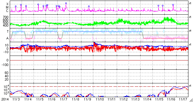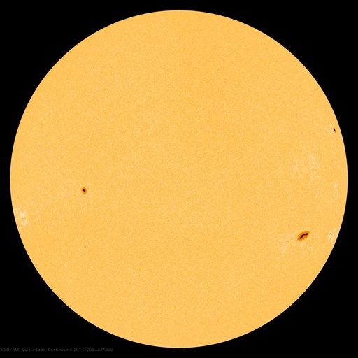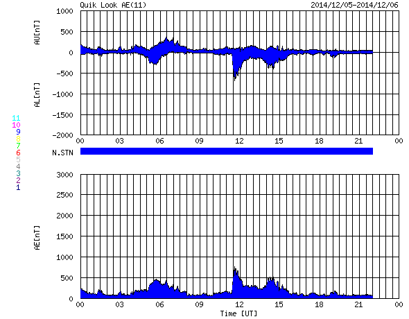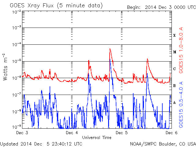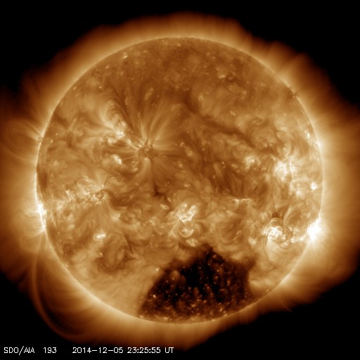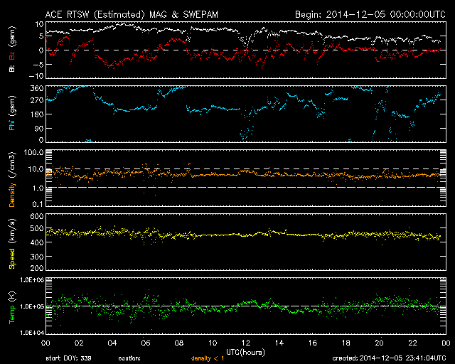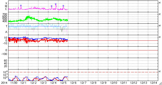 2014/12/ 6 08:41 更新 M1.5の中規模フレアが発生しました。コロナホールの影響が始まりそうです。 担当 篠原 2222黒点群では、フレアの発生が続いています。 昨夜、5日20時半(世界時5日11時半)に M1.5の中規模フレアを起こし、 その前後に、C1台のフレアを 5回起こしています。 一方、2222群の活動が更に強まる様子はなく、 現状程度に留まりそうです。 太陽風は、480km/秒から少し速度を落として440km/秒です。 やや高速の状態は続いています。 磁場強度は、5nTと平均的な強度に戻っています。 SDO衛星AIA193の太陽コロナ写真では、 南半球のコロナホールは、西側(右側)に進み、 地球への影響が強まる目安の位置に近づいています。 今後、より影響が強まる様だと、 速度は再び上昇するでしょう。 磁場の南北成分は、 0nTを挟んで、南北に小さく変化しています。 このため、磁気圏では、 激しくはないものの変動が起こりやすくなっていて、 AE指数は、500nT前後の変化が3回ほど記録されています。 今後、コロナホールの影響がどの程度になるか注目しています。 ![]() SDO衛星のAIA193カメラによる太陽コロナの様子 (c) SDO (NASA) ![]() SDO衛星による太陽の可視光写真。マウスの矢印を写真に重ねると、黒点番号付きの写真に切り替わります。 (c) SDO (NASA) ![]() GOES衛星の太陽X線データ (c) NOAA/SWPC ![]() ACEが観測した太陽風の磁場(1番上の枠、白線は全体の強度、赤線は南北成分) および、太陽風の密度(3番目の橙線)、速度(4番目の黄線) (c) NOAA/SWPC ![]() リアルタイムAE指数 下段のAEグラフの値が高くなると、オーロラ活動が活発化しています。 (c) 京都大学, NICT ![]() 27日の太陽周期に合わせたデータプロット 太陽が同じ面を地球に向けていた27日前の変化から、今後を予想することができます。 (c) 作図:宇宙天気ニュース