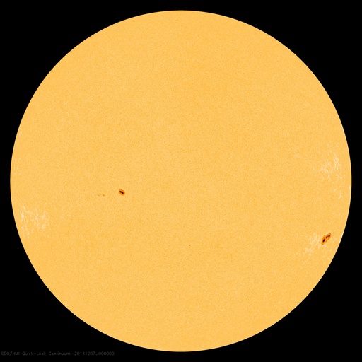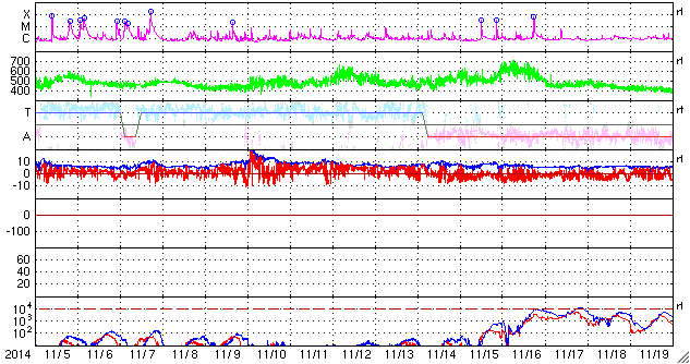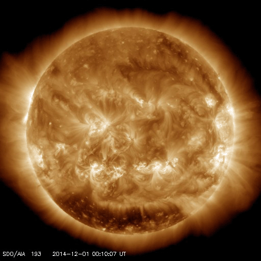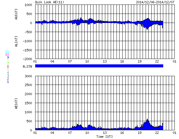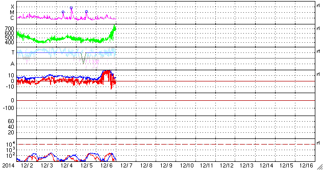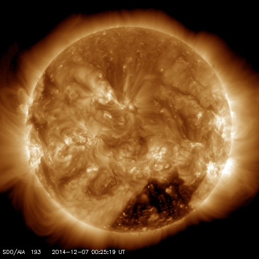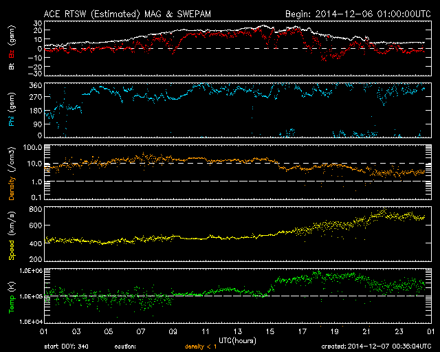 2014/12/ 7 09:32 更新 700km/秒の高速太陽風が到来しました。 担当 篠原 700km/秒に達する高速の太陽風が到来しています。 昨日のニュース以降、太陽風の磁場強度は次第に上昇して、 夕方、6日18時(世界時6日9時)には、20nTにまで強まりました。 27日周期の図を見ると、強まり方の大きさがよく分かります。 半日ほど遅れて速度も上昇を始め、 今朝、7日6時(世界時6日21時)には、 700km./秒とかなり高い速度の太陽風に変わりました。 高速風の原因は、太陽の南半球に広がるコロナホールです。 12月1日から今朝までのコロナホールの様子を、 SDO衛星AIA193の動画にしました。 低緯度側へ大きく広がった領域が太陽の西側に進んでいます。 このコロナホールが太陽の中心部に 位置していた頃に吹き出した高速風が地球に達したのです。 速度が上がり始めるとともに、磁場強度は下がり、 現在は、7nTと平均的な値に戻りかけています。 一方、速度は700km/秒を保っていて、 高速状態はしばらく続きそうです。 磁気圏への影響度を決める、磁場の南北成分は、 磁場が強まった時間帯は北向きに振れ、 磁気圏の変動はほとんど強まりませんでした。 速度が上がった頃から、 磁場は0nT付近で南北に変化する様に変わっています。 振れ幅は小さいですが、 AE指数には500nTの変化も発生していて、 今後のオーロラ活動に注目して下さい。 太陽は、2222黒点群でCクラスの小規模フレアが続いていて、 C4.4を最高に、C1〜4のフレアが7回ほど記録されています。 変化としては小さくなっています。 2222黒点群は、次第に西の端に近づいています。