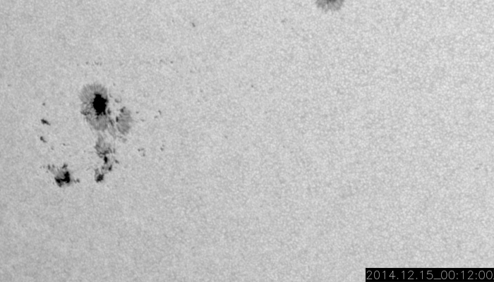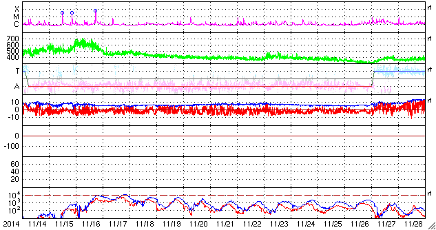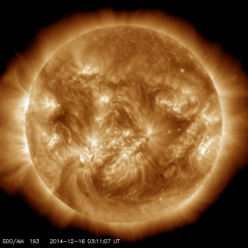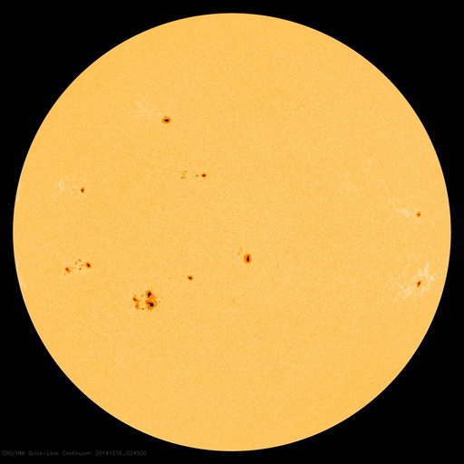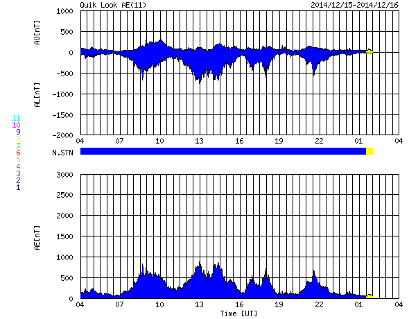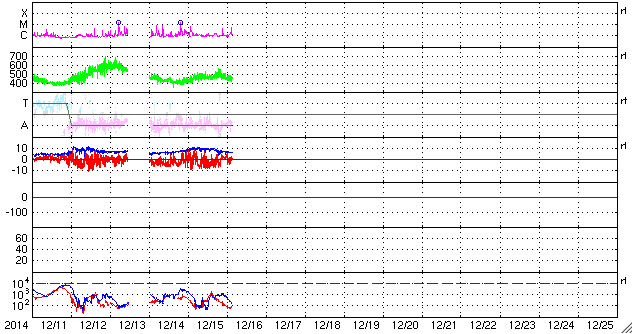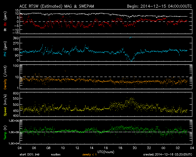 2014/12/16 12:20 更新 2242黒点群は広がっていますが、フレアは減っています。太陽風はやや高速です。 担当 篠原 太陽の中央部南側の2242黒点群が更に大きくなっています。 この1日間の変化をSDO衛星の拡大写真で紹介します。 黒点群は、同じ形の黒点が上下に2つ並んだような、 面白い姿になっています。 2242群のフレアは、昨日昼のC7.0以降は、 C4.5とC1.3の小規模フレアを起こした程度で、 活動は少なくなっています。 一方、磁場の構造はより複雑になっているそうで、 今後、活動が高まっていくかもしれません。 太陽風は、450km/秒とやや高速の状態で安定しています。 10nTに強まっていた磁場強度も、今日にかけて一段下がり、 現在は5nTと平均的な強さです。 磁気圏の活動は、 AE指数で600〜800nTの中規模の変化が度々発生しています。 グラフの最後の高まりにあたる、 世界時15日21時頃のノルウェー・トロムソのオーロラを 全天カメラの動画で紹介します。 今日は黒点群の動画を掲載しているため、 ファイルサイズの関係でオーロラの動画は短くしています。 この前後にもきれいなオーロラの活動が撮影されています。 これから太陽風は、 コロナホールの影響を受けてより強まるか、 27日前の前周期の様に、次第に弱まっていくか、 今後の変化に注目して下さい。 ![]() 2242黒点群の変化。SDO衛星。 (c) SDO (NASA)、 (動画加工 : 宇宙天気ニュース) ![]() ノルウェー・トロムソの全天カメラにより撮影された、世界時15日21時頃のオーロラ。 (c) 国立極地研究所、(動画加工 : 宇宙天気ニュース) ![]() SDO衛星のAIA193カメラによる太陽コロナの様子 (c) SDO (NASA) ![]() SDO衛星による太陽の可視光写真。マウスの矢印を写真に重ねると、黒点番号付きの写真に切り替わります。 (c) SDO (NASA) ![]() GOES衛星の太陽X線データ (c) NOAA/SWPC ![]() ACEが観測した太陽風の磁場(1番上の枠、白線は全体の強度、赤線は南北成分) および、太陽風の密度(3番目の橙線)、速度(4番目の黄線) (c) NOAA/SWPC ![]() リアルタイムAE指数 下段のAEグラフの値が高くなると、オーロラ活動が活発化しています。 (c) 京都大学, NICT ![]() 27日の太陽周期に合わせたデータプロット 太陽が同じ面を地球に向けていた27日前の変化から、今後を予想することができます。 (c) 作図:宇宙天気ニュース