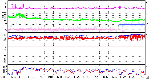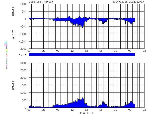 下段のAEグラフの値が高くなると、オーロラ活動が活発化しています。