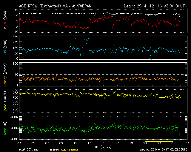 - 2014/12/12 13:16 太陽風の速度は450m/秒とやや高めです。太陽は穏やかです。