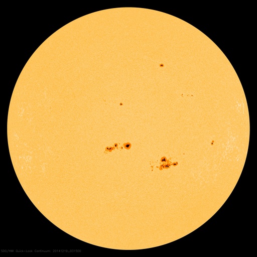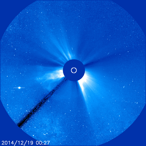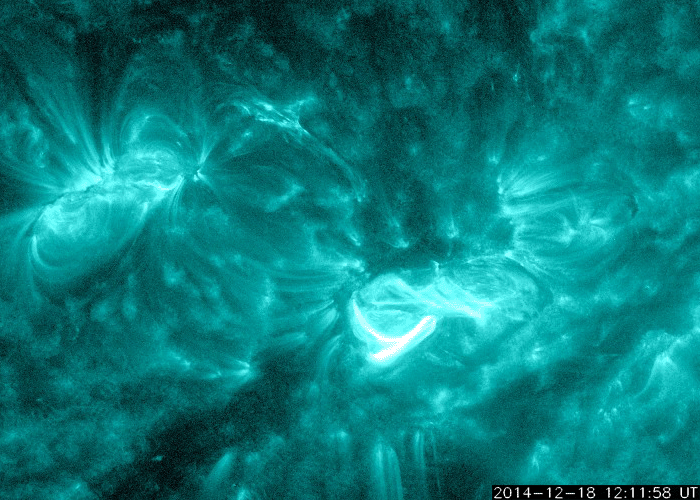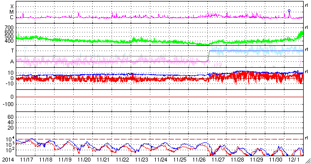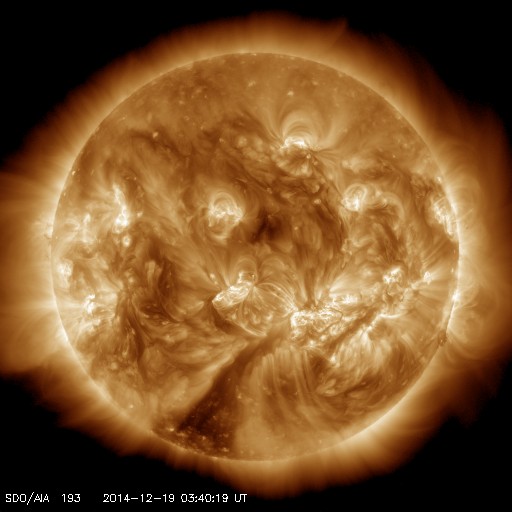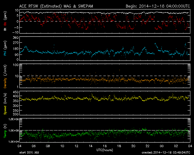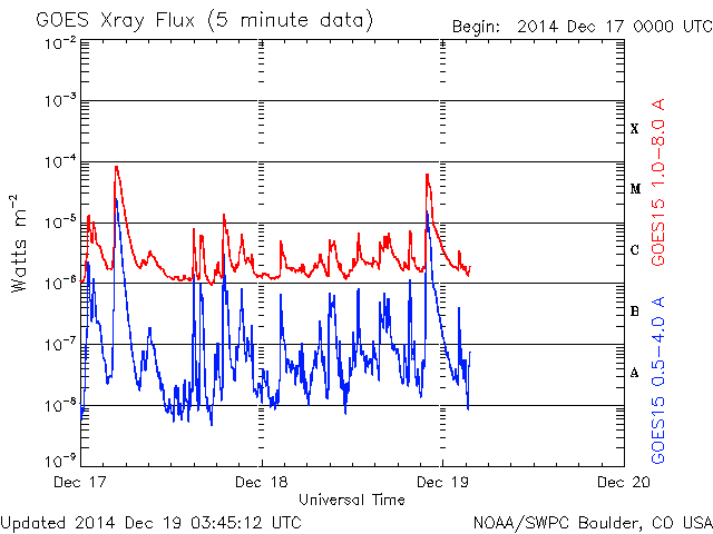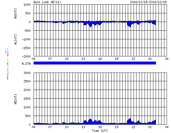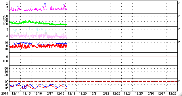 2014/12/19 12:49 更新 M6.9の中規模フレアが発生しました。CMEによる太陽風の乱れが近づいています。 担当 篠原 太陽中央部の2241黒点群で、 今朝、19日6時半(世界時18日21時半)に、 M6.9の中規模フレアが発生しました。 右下の2242黒点群の活動とともに、 SDO衛星AIA131による動画をご覧下さい。 SOHO衛星LASCO C3の写真が揃っていないのですが、 この中規模フレアに伴って、CMEも噴出した様です。 太陽を包む様に広がる、ハロー型のCMEが撮影されています。 明後日、21日くらいから22日にかけて、 太陽風の乱れが到来する可能性があります。 昨日お知らせした2242群のフレアによるCMEとともに、 しばらく太陽風の乱れが続くかもしれません。 GOES衛星のX線グラフは、 たくさんのCクラスフレアでにぎやかです。 引き続きフレアの発生に注意して下さい。 太陽風は、360〜380km/秒とやや低速の状態が続いています。 磁場強度も、7nTと少し高めですが安定しています。 磁気圏も比較的穏やかで、 AE指数は、200〜300nTの小さい変化が 時々発生している程度です。 27日周期の図の前周期の様子からは、 太陽風はこのまま穏やかな状態が続きそうですが、 昨日のCMEによる乱れが、 今夜から明日にかけて地球にやって来そうです。 乱れがやって来て、 磁場が強まリ、大きく南向きに振れると、 オーロラの活動は激しくなります。 ライブカメラとともに、太陽風のデータにも注目してください。