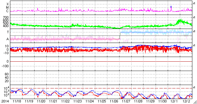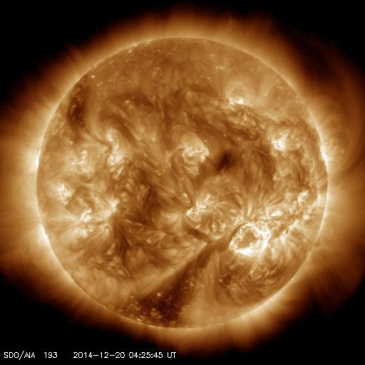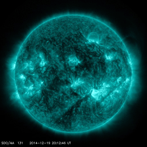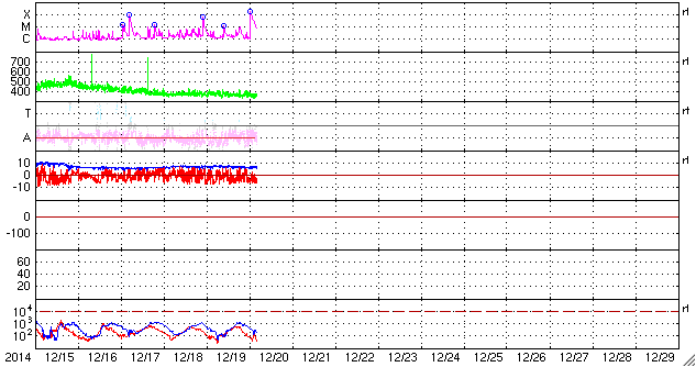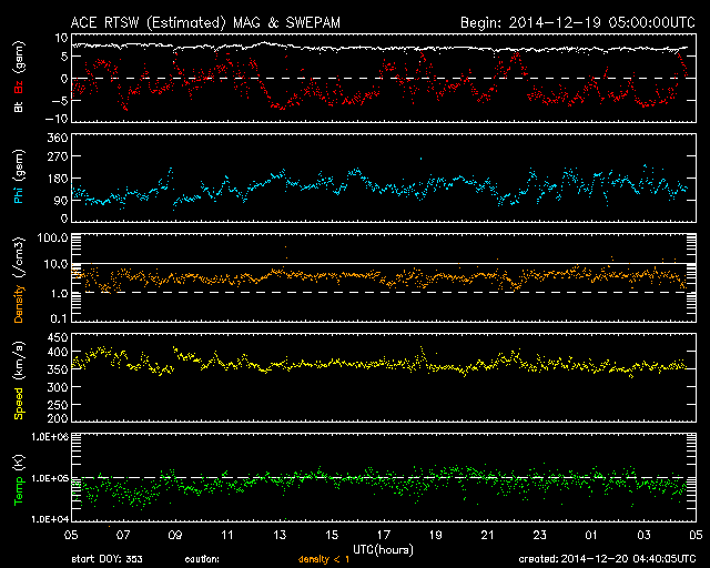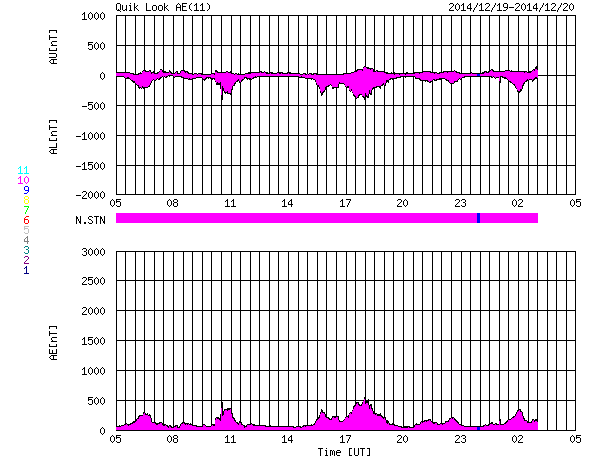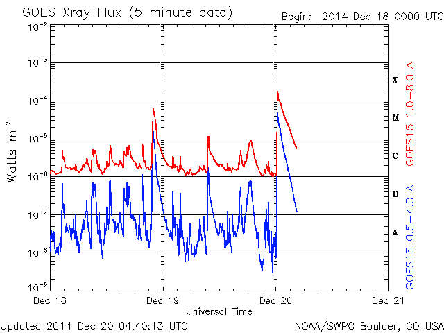 2014/12/20 13:41 更新 X1.8の大規模フレアが発生しました。太陽風は穏やかです。ノルウェーのオーロラをどうぞ。 担当 篠原 ノルウェーのトロムソに滞在中の伊勢亀氏より、 現地18日22時に撮影されたオーロラの写真をいただきました。 オーロラの見事な帯が北斗七星と重なる様に伸びています。 AE指数では200〜300nTと激しい変動ではありませんでしたが、 上空の赤い色も写っていて、とてもきれいです。 トロムソに滞在中とのことですので、 今後の太陽風擾乱による激しい活動も期待できそうです。 きれいな写真をありがとうございます。 今朝、20日9時(世界時20日0時)に、 太陽の南西(右下)の2242黒点群で、 X1.8の大規模フレアが発生しました。 SDO衛星AIA131によるフレアの様子を、動画で掲載します。 太陽の右下で、激しい爆発が発生しています。 動画の様子では、フレアとともにガスの噴出も起きている様です。 SOHO衛星の写真が更新されていないのではっきりしませんが、 CME(太陽ガスの放出現象)も起きているのではないでしょうか。 詳しくは明日のニュースでお知らせできると思います。 2242黒点群は、このフレアの前にも、 M1.3の中規模フレアや、 C9.5を最大にCクラスフレアを10回ほど起こしています。 活発な状態が続いていて、引き続き注目して下さい。 現在の太陽風は、速度が350km/秒に下がり、低速の状態です。 磁場強度も6nTと平均的な強さで安定しています。 17日のCMEによる太陽風の乱れの到来が予想されていましたが、 今のところ静かに推移しています。 次のCMEも起きているので、引き続き太陽風の変化に注意して下さい。 AE指数は、300〜500nTの小規模の変化が度々発生しています。 極域の空は、ある程度にぎやかになっているのではないでしょうか。 ![]() ノルウェーのトロムソで、現地18日22時頃、伊勢亀氏により撮影されたオーロラ。 (c) 伊勢亀氏 ![]() ノルウェーのトロムソで、現地18日22時頃、伊勢亀氏により撮影されたオーロラ。 (c) 伊勢亀氏 ![]() 2242黒点群で発生したX1.8の大規模フレア。SDO衛星AIA131。 (c) SDO (NASA)、 (動画加工 : 宇宙天気ニュース) ![]() SDO衛星のAIA193カメラによる太陽コロナの様子 (c) SDO (NASA) ![]() SDO衛星による太陽の可視光写真。マウスの矢印を写真に重ねると、黒点番号付きの写真に切り替わります。 (c) SDO (NASA) ![]() GOES衛星の太陽X線データ (c) NOAA/SWPC ![]() ACEが観測した太陽風の磁場(1番上の枠、白線は全体の強度、赤線は南北成分) および、太陽風の密度(3番目の橙線)、速度(4番目の黄線) (c) NOAA/SWPC ![]() リアルタイムAE指数 下段のAEグラフの値が高くなると、オーロラ活動が活発化しています。 (c) 京都大学, NICT ![]() 27日の太陽周期に合わせたデータプロット 太陽が同じ面を地球に向けていた27日前の変化から、今後を予想することができます。 (c) 作図:宇宙天気ニュース