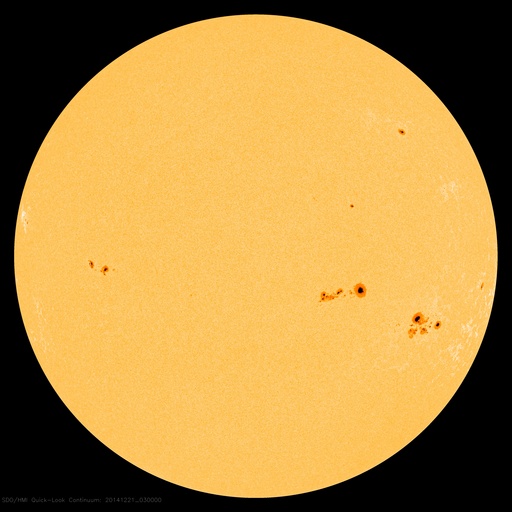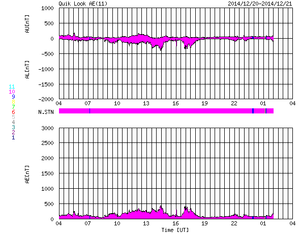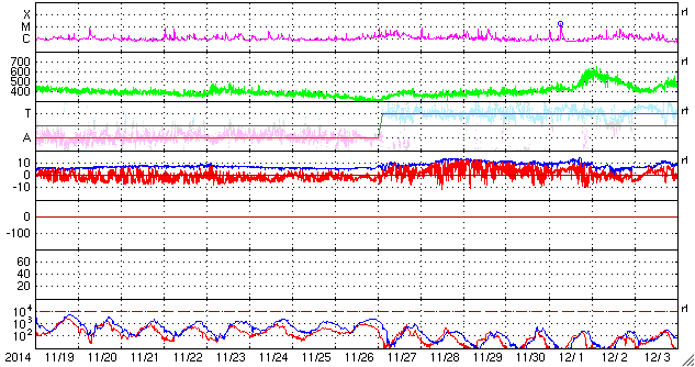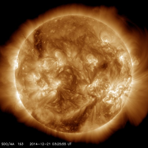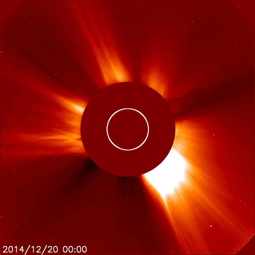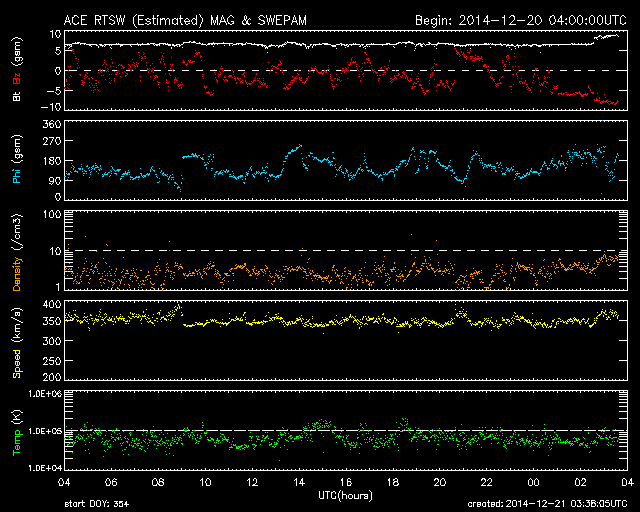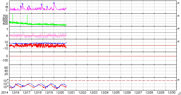 2014/12/21 12:38 更新 太陽風は低速ですが、小さい乱れが到来した様です。 担当 篠原 昨日のX1.8の大規模フレアに伴って発生した CME(太陽ガスの放出現象)の様子を、 SOHO衛星LASCO C2、C3の動画で紹介します。 CMEのガスは、主に太陽から右下に向かって噴出しています。 地球の方向へも向かっているかもしれませんが、 かなり淡く見えていてはっきりしません。 このため、太陽風の乱れが到来しても、 それほど大きくはならないのではないでしょうか。 Xフレアを起こした2242黒点群は、 その後も、C2/3、C2.9、C2.0、C5.6と 小規模フレアを起こしています。 大きい姿も保っていて、引き続き注目して下さい。 太陽風は、350km/秒と低速の穏やかな風が続いています。 先ほど、磁場強度に小さい変化がやって来て、 6nTから8nTに強度が上がっています。 最初のCMEの影響が到来したのかもしれません。 速度や密度には目立った変化はありませんが、 この少し前から、磁場の南北成分が南向きに振れ始め、 現在、-8nTに強まっています。 この変化がしばらく続くと、 磁気圏の活動がある程度活発になるでしょう。 今後の推移に注目して下さい。 また、19日に発生したCMEの乱れが近づいています。 こちらについても注意して下さい。 ![]() 20日のX1.8の大規模フレアに伴って発生したCMEの様子。SOHO衛星LASCO C2、C3。 (c) SOHO (ESA & NASA)、(動画加工 : 宇宙天気ニュース ) ![]() SDO衛星のAIA193カメラによる太陽コロナの様子 (c) SDO (NASA) ![]() SDO衛星による太陽の可視光写真。マウスの矢印を写真に重ねると、黒点番号付きの写真に切り替わります。 (c) SDO (NASA) ![]() GOES衛星の太陽X線データ (c) NOAA/SWPC ![]() ACEが観測した太陽風の磁場(1番上の枠、白線は全体の強度、赤線は南北成分) および、太陽風の密度(3番目の橙線)、速度(4番目の黄線) (c) NOAA/SWPC ![]() リアルタイムAE指数 下段のAEグラフの値が高くなると、オーロラ活動が活発化しています。 (c) 京都大学, NICT ![]() 27日の太陽周期に合わせたデータプロット 太陽が同じ面を地球に向けていた27日前の変化から、今後を予想することができます。 (c) 作図:宇宙天気ニュース