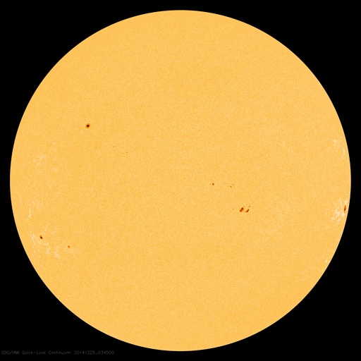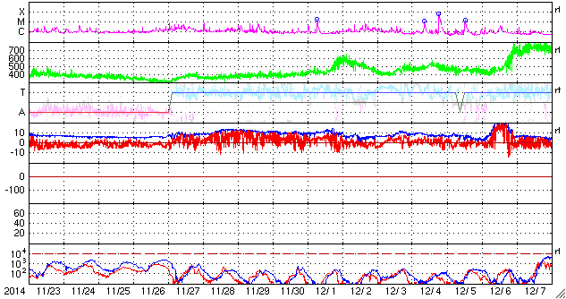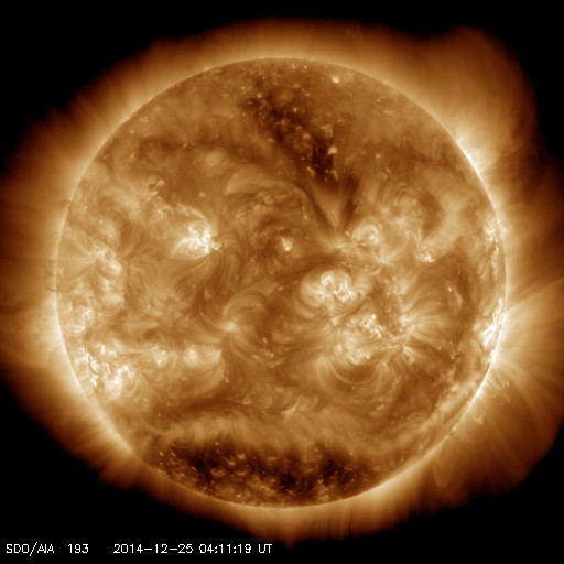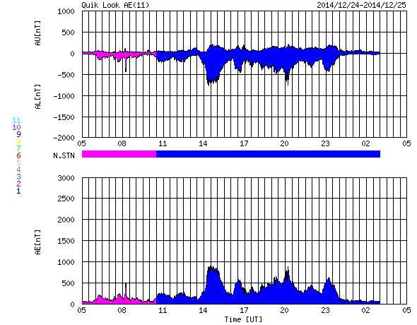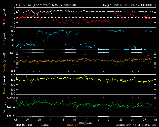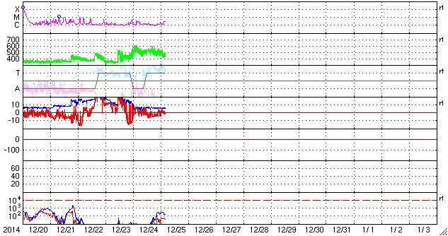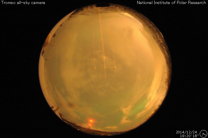 2014/12/25 13:28 更新 太陽風の速度は下がり、乱れは終わりつつあります。 担当 篠原 太陽風の速度は、550km/秒から450km/秒へ下がり、 太陽風の乱れは終わりつつあります。 磁場強度は、既に5nTと平均的な値で安定しています。 磁場の南北成分は、 南に振れたり、北に振れたり、 ゆっくりと変化しています。 このため、磁気圏の活動も活発な時間帯があり、 AE指数は、500〜800nTと中規模の変化が 半日ほど続いています。 4日連続になりますが、 ノルウェー・トロムソの 全天カメラのオーロラ動画を掲載します。 ただし、今日は天候が悪くなっていて、 雲越しのオーロラ観望です。 AE指数が800nTくらいに高まった頃のオーロラです。 太陽は、C1〜3の小規模フレアが4回ほど、 西に沈んでいった2242群と、 東側の2245群で発生しています。 2242群が見えなくなり、 太陽の活動は静かになりそうです。 ![]() ノルウェー・トロムソの全天カメラにより撮影された、世界時24日20時頃のオーロラ。 (c) 国立極地研究所、(動画加工 : 宇宙天気ニュース) ![]() SDO衛星のAIA193カメラによる太陽コロナの様子 (c) SDO (NASA) ![]() SDO衛星による太陽の可視光写真。マウスの矢印を写真に重ねると、黒点番号付きの写真に切り替わります。 (c) SDO (NASA) ![]() ACEが観測した太陽風の磁場(1番上の枠、白線は全体の強度、赤線は南北成分) および、太陽風の密度(3番目の橙線)、速度(4番目の黄線) (c) NOAA/SWPC ![]() リアルタイムAE指数 下段のAEグラフの値が高くなると、オーロラ活動が活発化しています。 (c) 京都大学, NICT ![]() 27日の太陽周期に合わせたデータプロット 太陽が同じ面を地球に向けていた27日前の変化から、今後を予想することができます。 (c) 作図:宇宙天気ニュース