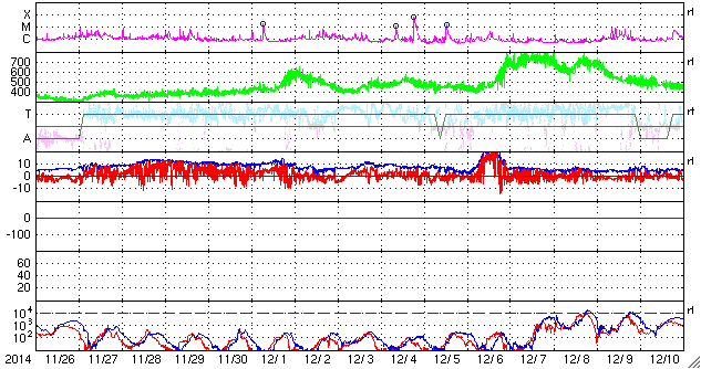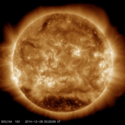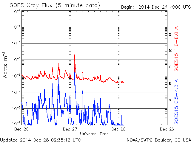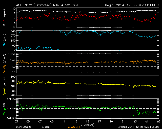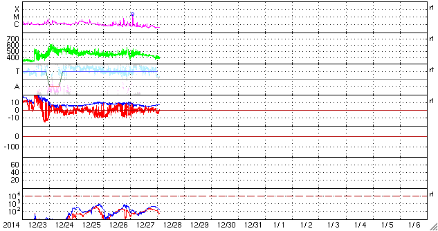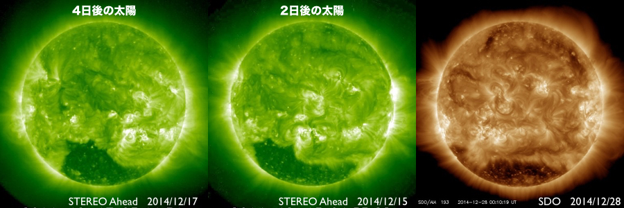2014/12/28 11:35 更新 太陽風は平均的な速度に戻っています。M2の中規模フレアが起きました。 担当 篠原 太陽風の速度(ACEの図の黄色線)は、 昨日のニュースの後に再び470km/秒に高まり、 やや高速の状態が続いていましたが、 今朝に入って一段下がり、 400km/秒と平均的な速度に戻っています。 磁場強度(白線)は、昨日の10nTからは少し下がりましたが、 7〜8nTにやや強まった状態が続いています。 太陽風磁場の南北成分(赤線)は、 0nT付近で小さく変化する様になり、 磁気圏の活動も小さくなっています。 AE指数の変化は、小さい山が2つ見られる程度です。 SDO衛星AIA193の太陽コロナの写真を見ると、 南半球の高緯度域にコロナホールが大きく広がっています。 このコロナホールは、これから低緯度側に広がっていき、 太陽風に大きく影響するようになります。 太陽の反対側で観測している STEREO Ahead衛星の写真を参考にして、 2日後、4日後のコロナホールの様子を紹介します。 これによると、4日後の1月1日には、 コロナホールの広がりは太陽の中央付近に達しそうです。 そして、この影響は、27日周期の図の12月7〜8日に見られる 高速太陽風の回帰として、1月3〜4日を中心に到来しそうです。 2015年の始まりは、 このコロナホールと高速太陽風の到来になりそうです。 太陽では、昨日の昼、27日11時(世界時27日2時)に、 活動が高まっていた2249黒点群で M2.2の中規模フレアが発生しました。 昨日お知らせした様に、 2249群はそれまでも活発にフレアを起こしていたのですが、 M2フレア以降は、C1.9の小規模フレアを起こしただけで、 静かになっています。