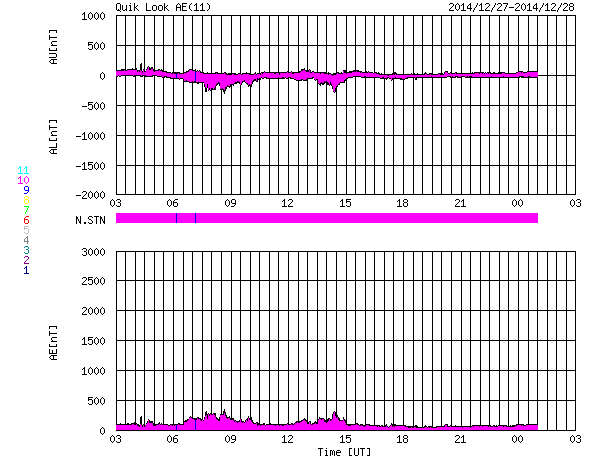 (c) SDO (NASA)、STEREO (NASA)、 ![]() SDO衛星のAIA193カメラによる太陽コロナの様子 (c) SDO (NASA) ![]() SDO衛星による太陽の可視光写真。マウスの矢印を写真に重ねると、黒点番号付きの写真に切り替わります。 (c) SDO (NASA) ![]() ACEが観測した太陽風の磁場(1番上の枠、白線は全体の強度、赤線は南北成分) および、太陽風の密度(3番目の橙線)、速度(4番目の黄線) (c) NOAA/SWPC ![]() リアルタイムAE指数 下段のAEグラフの値が高くなると、オーロラ活動が活発化しています。 (c) 京都大学, NICT ![]() 27日の太陽周期に合わせたデータプロット 太陽が同じ面を地球に向けていた27日前の変化から、今後を予想することができます。 (c) 作図:宇宙天気ニュース