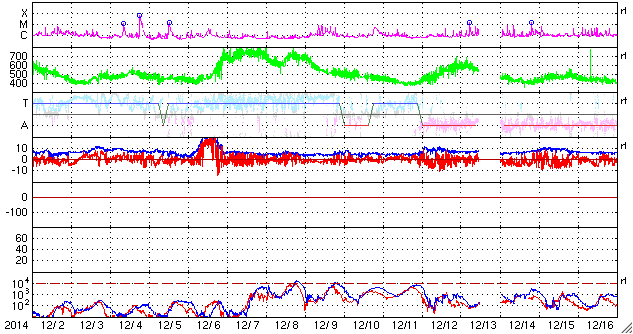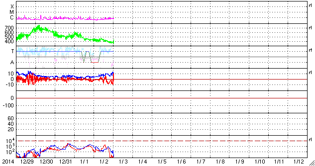 2014/12/30 10:23 太陽風は700km/秒近い高速風になっています。磁気圏の活動も活発です。