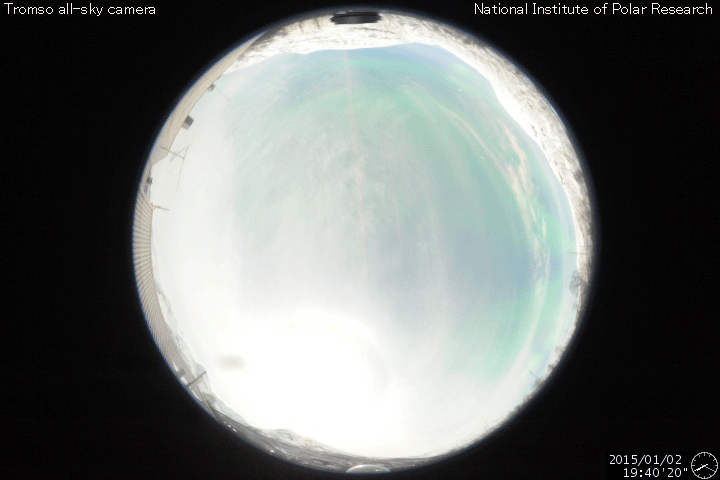 ノルウェー・トロムソの全天カメラで撮影された、世界時2日20〜21時頃のオーロラ。