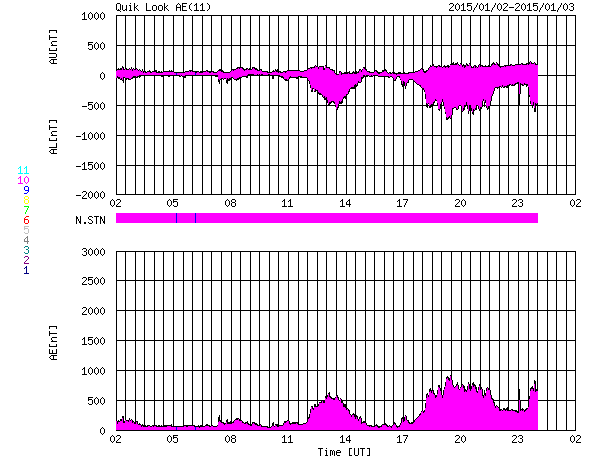 下段のAEグラフの値が高くなると、オーロラ活動が活発化しています。