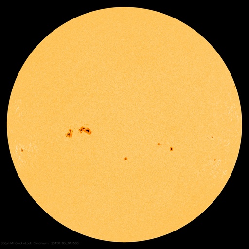 SDO衛星による太陽の可視光写真。マウスの矢印を写真に重ねると、黒点番号付きの写真に切り替わります。
