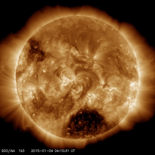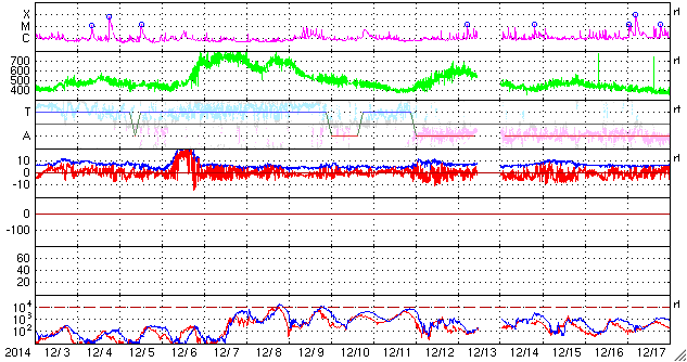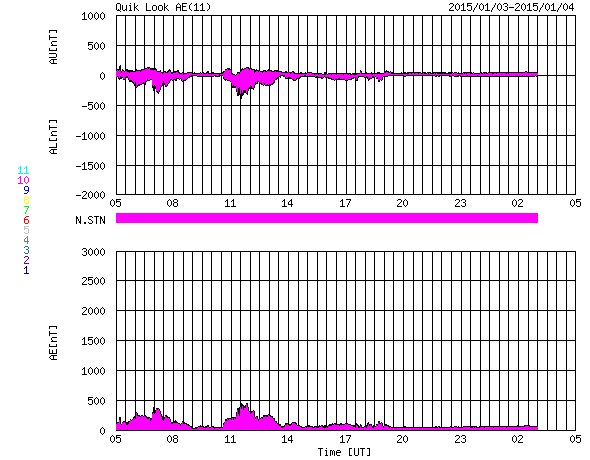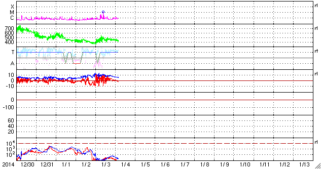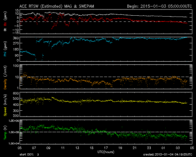 2015/ 1/ 4 13:20 更新 太陽風は平均的な状態に戻っています。M1の中規模フレアが発生しました。 担当 篠原 昨日少し高まっていた太陽風は、平均的な状態に戻っています。 速度は、450km/秒前後とやや高速になっていましたが、 昼頃に400km/秒近くへ下がっています。 10nTに強まっていた磁場強度も、今日に入った頃から下がり始め、 現在は5nTと平均的な値です。 27日周期の図を見ると、 前周期は既に高速太陽風が到来していましたが、 今回はまだ始まっていません。 SDO衛星AIA193の写真では、 コロナホールは西側にだいぶ移動していて、 影響が及び始めてもよい頃です。 引き続き注目して下さい。 磁気圏の活動は小規模に留まり、 AE指数は前半に300nTくらいの変化が見られる程度です。 太陽では、中央部の2253黒点群の活動がやや強まっています。 昨夕、3日18時半(世界時3日9時半)に、M1.1と、 2015年最初のMクラスフレアが発生しました。 2253群は、この前にC1〜C4の小規模フレアを5回、 以降に、C1の小さいフレアを6回起こしています。 GOES衛星のX線グラフも、変化が目立っています。 ![]() SDO衛星のAIA193カメラによる太陽コロナの様子 (c) SDO (NASA) ![]() SDO衛星による太陽の可視光写真。マウスの矢印を写真に重ねると、黒点番号付きの写真に切り替わります。 (c) SDO (NASA) ![]() ACEが観測した太陽風の磁場(1番上の枠、白線は全体の強度、赤線は南北成分) および、太陽風の密度(3番目の橙線)、速度(4番目の黄線) (c) NOAA/SWPC ![]() リアルタイムAE指数 下段のAEグラフの値が高くなると、オーロラ活動が活発化しています。 (c) 京都大学, NICT ![]() 27日の太陽周期に合わせたデータプロット 太陽が同じ面を地球に向けていた27日前の変化から、今後を予想することができます。 (c) 作図:宇宙天気ニュース