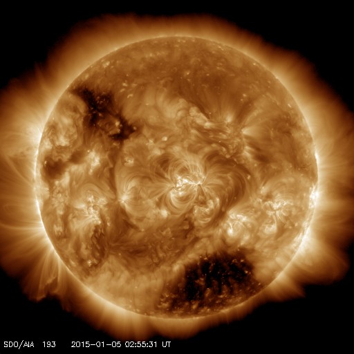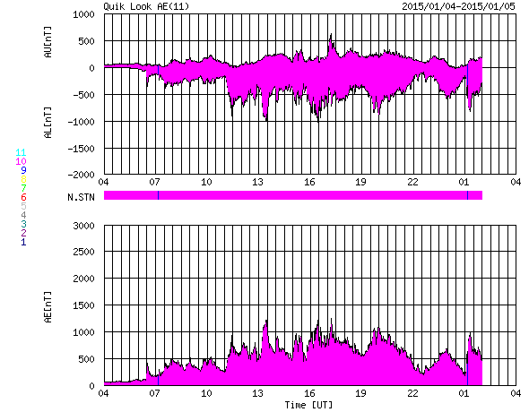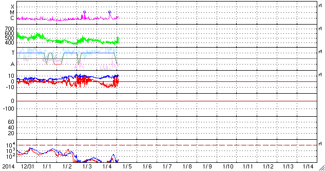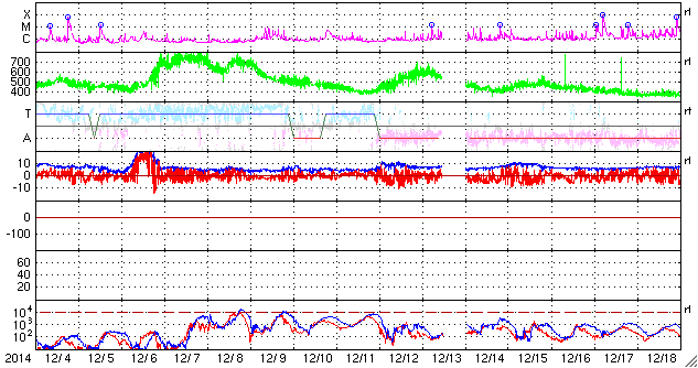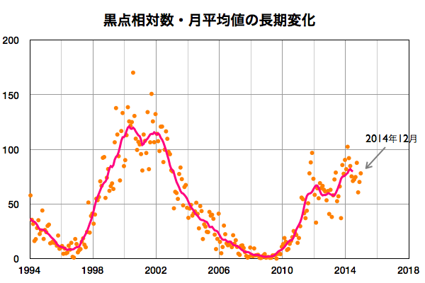 2015/ 1/ 5 12:02 更新 高速太陽風が到来し、速度は500km/秒に上がっています。12月の黒点数は78.0でした。 担当 篠原 2014年12月の黒点相対数の平均値は、78.0 と、 WDC-SILSOより発表されました。 10月の60.6、11月の70.1よりも少し上がりましたが、 長期変化のグラフを見ると、 極小へ向かう大きな流れの中の変化です。 これから2015年はどの様な推移をするのでしょうか。 太陽風は、昨日の午後から磁場強度が高まり始め、 夜には10nTに達し、現在まで強まった状態が続いています。 速度は、400km/秒と平均的な状態で安定していましたが、 今朝に入って上がり始め、 現在は500km/秒と高速の風に変わっています。 磁場の南北成分は、昨日のニュース以降、南向きに切り替わり、 昨夜には-10nTに達するほどになりました。 このため、磁気圏の活動度が高まり、 AE指数は1000nTを前後する活発な変化が、 ほぼ一日にわたって発生しています。 AE指数のグラフの、 最後から2番目の高まりの頃のオーロラの様子を、 ノルウェー・トロムソの全天カメラの動画で紹介します。 満月のため空の条件はかなり厳しいですが、 オーロラの躍動する姿が見えています。 現在の太陽風磁場の南北成分は、 0nTを挟んで、南北に変化しています。 このまま北寄りに変わっていくと、 オーロラの活動は弱まっていくかもしれません。 現在の太陽風は、 27日周期の図の12月7〜10日に見られた高速風が 回帰しつつあるのかもしれません。 この後、太陽風の速度は更に高まるかもしれません。 太陽の中央部の2253黒点群では、 5日0時半(世界時4日15時半)に、 M1.3の中規模フレアが発生しています。 Mクラスフレアは2つめです。 2253群は、その前後にも C2.1、C1.9などの小規模フレアを起こしています。 鹿児島高専は、冬休みが終わり、 今日から授業を再開しています。 とても静かだった学校が、一転してにぎわっています。 ![]() 太陽黒点相対数の長期変化。 (c) 黒点データ:WDC-SILSO、作図:宇宙天気ニュース ![]() ノルウェー・トロムソの全天カメラにより撮影された、世界時4日23時〜5日0時頃のオーロラ。 (c) 国立極地研究所、(動画加工 : 宇宙天気ニュース) ![]() SDO衛星のAIA193カメラによる太陽コロナの様子 (c) SDO (NASA) ![]() SDO衛星による太陽の可視光写真。マウスの矢印を写真に重ねると、黒点番号付きの写真に切り替わります。 (c) SDO (NASA) ![]() ACEが観測した太陽風の磁場(1番上の枠、白線は全体の強度、赤線は南北成分) および、太陽風の密度(3番目の橙線)、速度(4番目の黄線) (c) NOAA/SWPC ![]() リアルタイムAE指数 下段のAEグラフの値が高くなると、オーロラ活動が活発化しています。 (c) 京都大学, NICT ![]() 27日の太陽周期に合わせたデータプロット 太陽が同じ面を地球に向けていた27日前の変化から、今後を予想することができます。 (c) 作図:宇宙天気ニュース