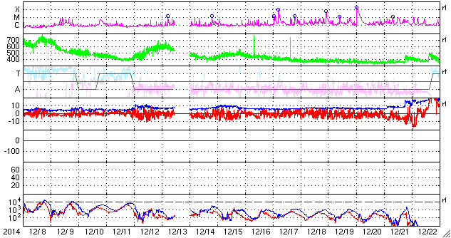 2015/ 1/ 5 12:02 高速太陽風が到来し、速度は500km/秒に上がっています。12月の黒点数は78.0でした。