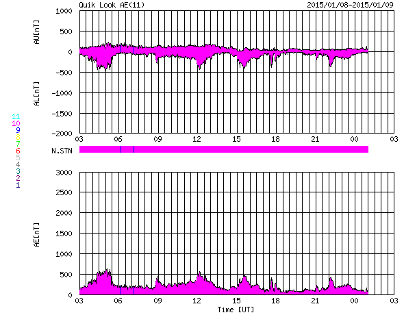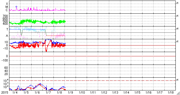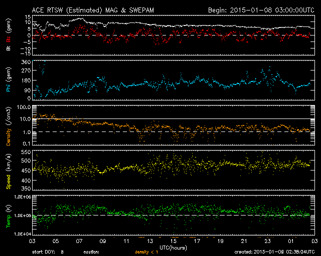 2015/ 1/ 8 12:42 太陽風磁場の強まりが到来し、中規模の磁気嵐が発生しました。