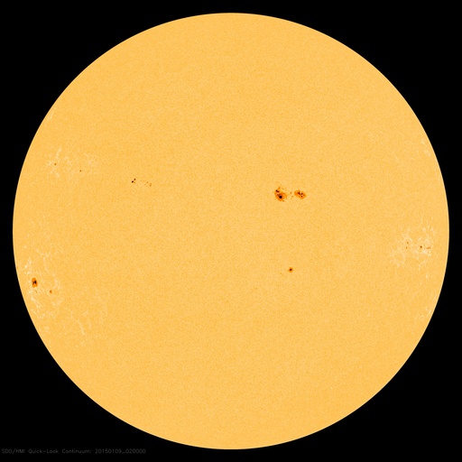 SDO衛星による太陽の可視光写真。マウスの矢印を写真に重ねると、黒点番号付きの写真に切り替わります。