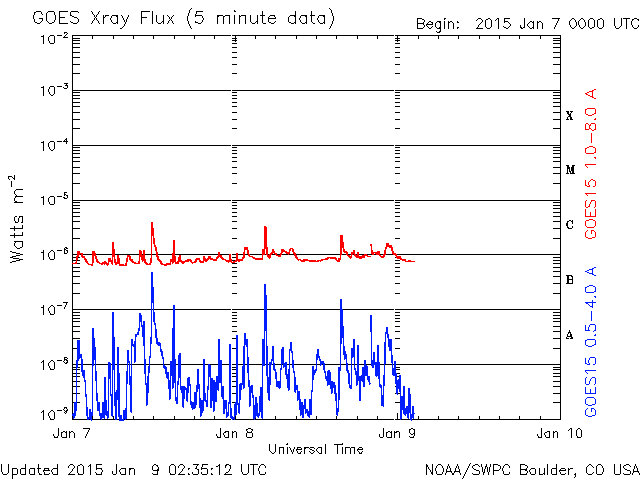 2015/ 1/ 6 11:48 太陽風の速度は少し下がっています。Cクラスのフレアが続いています。