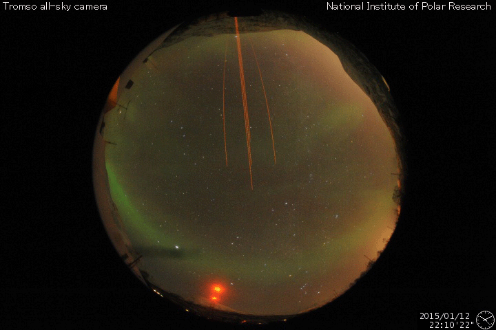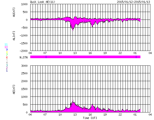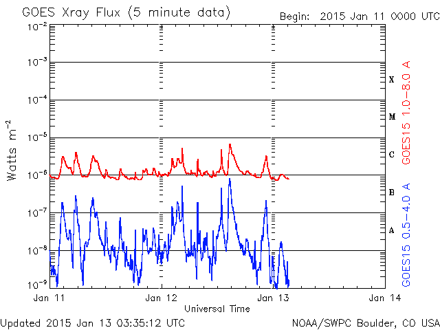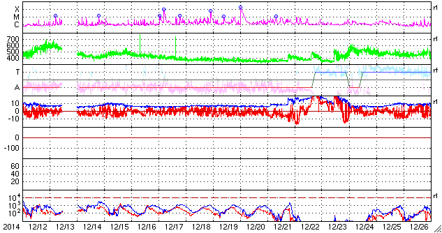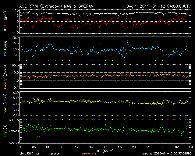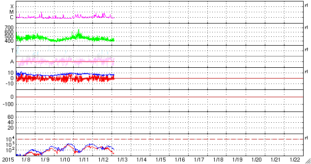 2015/ 1/13 12:38 更新 太陽風磁場の強まりが残っています。太陽でCクラスフレアが続いています。 担当 篠原 太陽風の速度は、440km/秒から420km/秒と平均的な速さで、 磁場強度は、7nTと少し強まった値で それぞれ安定しています。 磁場の南北成分は、振れ幅は小さいですが、 南寄りの傾向です。 このため、磁気圏の活動もある程度発生していて、 AE指数には、200nTから600nTにかけて、 小中規模の活動が長い時間続いています。 世界時12日22〜23時頃のノルウェー・トロムソの オーロラの動画を掲載します。 AE指数の変化は小さいですが、 きれいなオーロラの変動が撮影されています。 27日前の前周期の変化を参考にすると、 今後、太陽風の速度は300km/秒台の低速風になりそうですが、 磁場強度は少し強まった状態が続くかもしれません。 南方向への磁場変化も続けば、 オーロラの活動もある程度活発に続くでしょう。 太陽は、北西(右上)の2260黒点群が再び目立つ様になり、 昨日、12日13時半(世界時12日4時半)にC6.1、 12日22時(世界時12日13時)にもC5.6と、 少し大きいCクラスフレアを起こしています。 また、西端(右端)の2255黒点群も、 12日23時(世界時12日14時)にC7.1の小規模フレアと、 C3.1、C2.0などのフレアも起こしています。 これらのフレアにより、GOES衛星のX線グラフは 変化が目立っています。