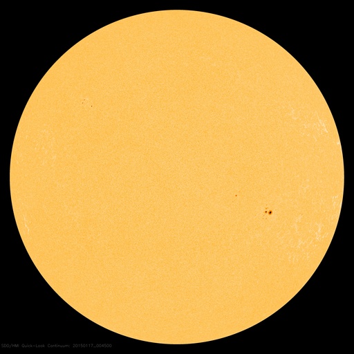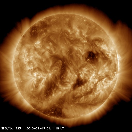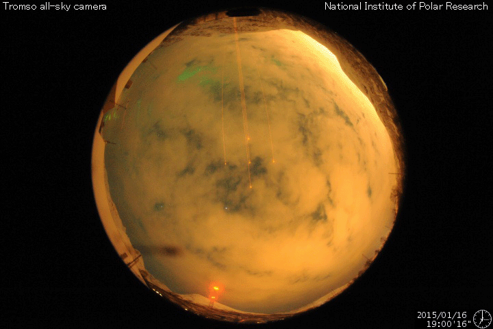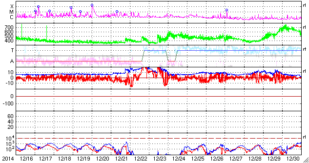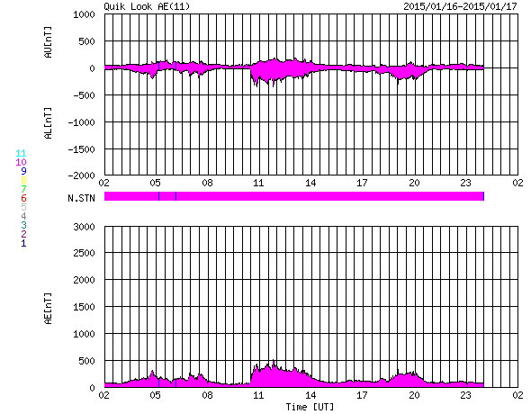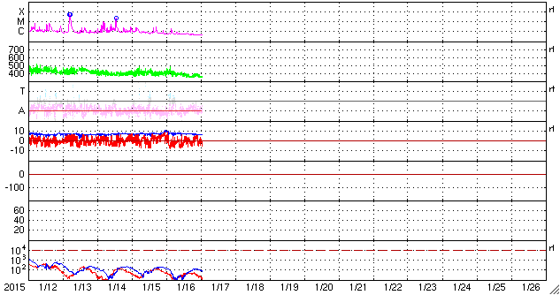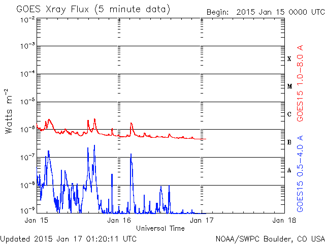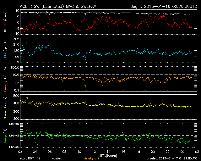2015/ 1/17 10:21 更新 太陽風は低速風に変わっています。太陽は穏やかです。 担当 篠原 太陽風の速度は、400km/秒から360km/秒へ低下し、 低速の風に変わっています。 磁場強度は、7nTに少し強まった状態が続いています。 磁場の南北成分は、南北にゆっくりと変化しています。 このため、磁気圏の活動も南に振れた頃に高まっていて、 AE指数は、200〜400nTの弱い高まりが数時間おきに発生しています。 図の最後の山にあたる、世界時16日19時頃のオーロラの様子を、 ノルウェー・トロムソの全天カメラの動画で紹介します。 天気がやや悪く、雲越しのオーロラ観望ですが、 雲の動きとの対比が印象的です。 太陽風は弱まってきましたが、 SDO衛星AIA193の西側(右側)に見えている 小規模のコロナホールの影響が、 明日くらいから多少やって来るかもしれません。 太陽は、活発だった黒点群が見えなくなったため、 フレアの発生は、沈んで行った2260群のC1.8だけで、 活動は穏やかになっています。 GOES衛星のX線グラフも、 変化のない静かな図になっています。