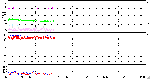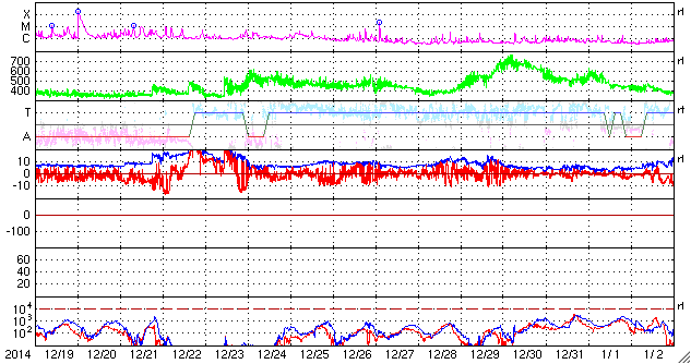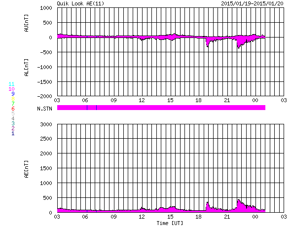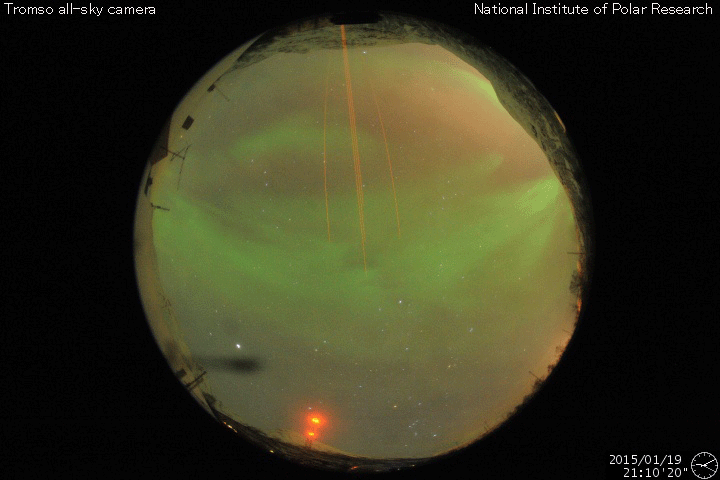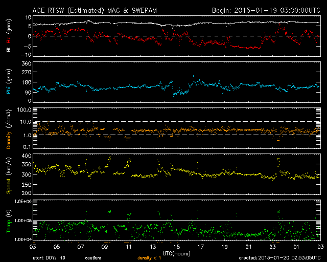 2015/ 1/20 11:54 更新 太陽風は300km/秒を割る低速風になっています。 担当 篠原 太陽風の速度は、320km/秒から更に下がって、 290km/秒に達しています。 速度が300km/秒まで下がるのは、およそ2ヶ月ぶりです。 27日周期で過去の太陽風速度の変化を見ると、 この4周期ほどは、 昨日のタイミングで速度が一番遅くなる変化をしていて、 今回も同じ変化になっている様です。 これから太陽風磁場のセクターの切り替わりが到来して、 速度も400km/秒程度へ上がっていくかもしれません。 今後の推移に注目して下さい。 太陽風磁場の強度は、6nTで安定しています。 磁場の南北成分は、 グラフの後半から南寄りになっています。 このため、AE指数もグラフの後半に 小規模の変化が発生しています。 AE指数の図の最後の山にあたる、 世界時19日21〜22時のオーロラの活動を、 ノルウェー・トロムソの動画で紹介します。 写真の右下の地平線近くを、オリオン座が横に動いています。 高度の低さが、緯度の違いを感じさせます。 太陽は、中央の2266黒点群で C1.0、C3.3の小規模フレアが発生していますが、 全体としては穏やかです。 東端から新しい黒点が現れています。 この領域の活動は、やや活発です。 ![]() ノルウェー・トロムソの全天カメラにより撮影された、世界時19日21〜22時頃のオーロラ。 (c) 国立極地研究所、(動画加工 : 宇宙天気ニュース) ![]() SDO衛星のAIA193カメラによる太陽コロナの様子 (c) SDO (NASA) ![]() SDO衛星による太陽の可視光写真。マウスの矢印を写真に重ねると、黒点番号付きの写真に切り替わります。 (c) SDO (NASA) ![]() ACEが観測した太陽風の磁場(1番上の枠、白線は全体の強度、赤線は南北成分) および、太陽風の密度(3番目の橙線)、速度(4番目の黄線) (c) NOAA/SWPC ![]() リアルタイムAE指数 下段のAEグラフの値が高くなると、オーロラ活動が活発化しています。 (c) 京都大学, NICT ![]() 27日の太陽周期に合わせたデータプロット 太陽が同じ面を地球に向けていた27日前の変化から、今後を予想することができます。 (c) 作図:宇宙天気ニュース