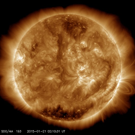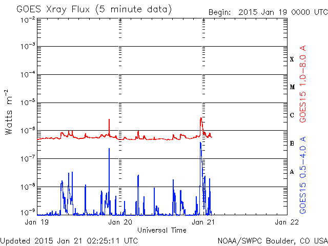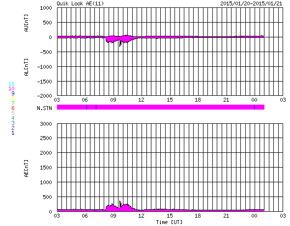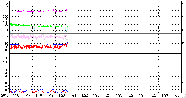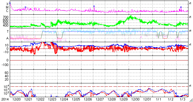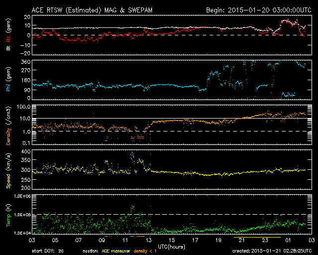 2015/ 1/21 11:29 更新 太陽風磁場が強まりましたが、北向きに振れたので、磁気圏は静穏です。 担当 篠原 今朝、21日9時(世界時21日0時)頃に、 太陽風の磁場強度が15nTに強まる変化が発生しました。 2時間ほど経った現在は、10nTを少し割る程度に下がっています。 27日周期の図を参照すると、 太陽風磁場のセクターの切り替わりに伴う変動の様です。 太陽風磁場の大まかな方向は、A (太陽から地球方向) から、 T (地球から太陽方向) へ切り替わっています。 太陽風の速度は、280km/秒から300km/秒へ少し上がった程度で、 変化は小さく、とても遅い状態が続いています。 磁気圏への影響度を決める太陽風磁場の南北成分は、 磁場が強まった時には、北を向いていたので、 磁気圏への影響は小さかったと思われます。 AE指数のグラフの後半は、今のところは全く変化していません。 磁場はこのまま北を向き続けるのか、 今後、南向きに切り替わるのか、 磁場が強まっている間は、磁気圏への影響もより大きくなります。 太陽は、東端の向こう側の領域で C2.9の小規模フレアが発生しています。 この後、どのような領域が姿を現すか注目して下さい。