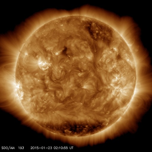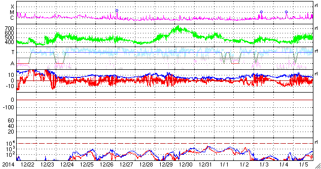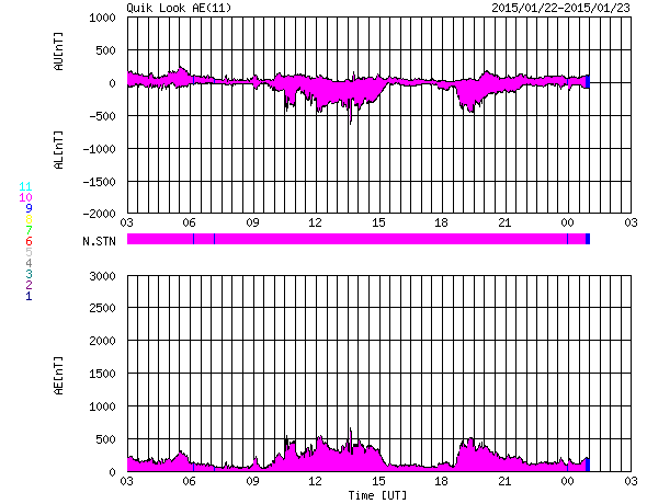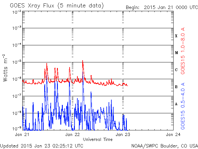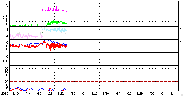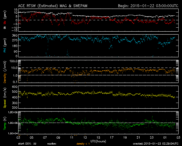 2015/ 1/23 11:30 更新 M1.4の中規模フレアが発生しました。太陽風は平均的な状態に戻っています。 担当 篠原 太陽の東端の黒点は、2268黒点群と番号が付きました。 昨日、22日13時半(世界時22日4時半)に、 M1.4の中規模フレアを起こしています。 しかし、それ以降はC1〜2の小さいフレアを3回起こした程度で、 静かになっています。 フレアの活動はここまでなのか、一休みなのか、 引き続き変化に注目して下さい。 太陽風は、昨日の470km/秒が最高速度だった様で、 今日に入った頃から速度は下がり始め、 現在は400km/秒と平均的な速度に戻っています。 磁場強度も、昨夜のうちに5nTに下がり、 以降、平均的な値で安定しています。 磁場の南北成分は、北に振れたり、南に振れたりと、 変化しています。 このため、磁気圏の活動も断続的に発生していて、 AE指数は200〜500nTの小規模の変化が、 繰り返し発生しています。 極域の空は、ある程度にぎわっていたのではないでしょうか。 太陽風は、穏やかになりましたが、 27日周期の図の前周期の変化を参考にすると、 明後日くらいから再び強まるかもしれません。 前周期は、12月28日頃から、 磁場強度は10nT、速度は700km/秒に達する 太陽風の強まりが到来しました。 今回はどの様な変化が見られるか、注目してください。
