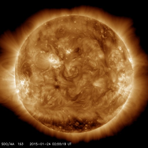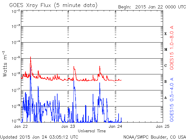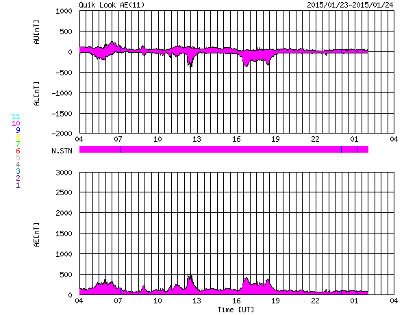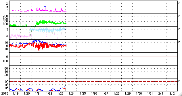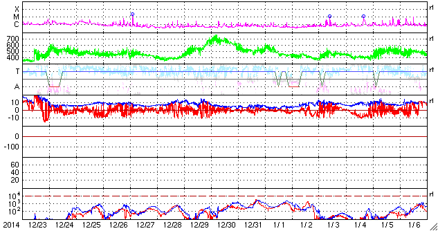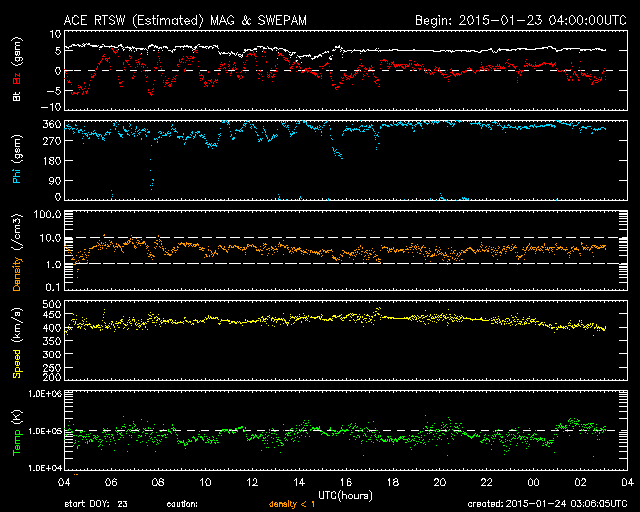 2015/ 1/24 12:06 更新 太陽風は平均的な状態で、磁気圏も比較的穏やかです。 担当 篠原 太陽の東橋の2268黒点群は、 23日12時(世界時23日3時)にC4.3、 24日1時(世界時23日16時)にC3.7の小規模フレアを起こし、 この他に、南隣りの2270黒点群とともに、 C1の小さいフレアを4回ほど起こしています。 2268黒点群のやや活動的な状態は、続いているようです。 太陽風は、速度が400km/秒から430km/秒に少し上がり、 再び400km/秒に戻る小さい変化をしています。 磁場強度は5nTで安定しています。 磁場の南北成分は、 ACEのグラフの前半は南北に変化していますが、 後半は0nT付近に留まるようになっています。 このため、オーロラの活動も、 AE指数のグラフの中盤までは小さい変化が起きていますが、 その後は変化がなくなっています。 このまま静かになってしまうのかどうか、 27日周期の図の前周期を参考に見ると、 太陽風は、12月28、29日から磁場強度や速度が強まって、 その後、700km/秒の高速風も到来しています。 今回もこの変化が回帰するのか、違う展開になるのか、 これから、明日、明後日にかけて、 ACE衛星の太陽風データに注目してください。 ![]() SDO衛星のAIA193カメラによる太陽コロナの様子 (c) SDO (NASA) ![]() SDO衛星による太陽の可視光写真。マウスの矢印を写真に重ねると、黒点番号付きの写真に切り替わります。 (c) SDO (NASA) ![]() GOES衛星の太陽X線データ (c) NOAA/SWPC ![]() ACEが観測した太陽風の磁場(1番上の枠、白線は全体の強度、赤線は南北成分) および、太陽風の密度(3番目の橙線)、速度(4番目の黄線) (c) NOAA/SWPC ![]() リアルタイムAE指数 下段のAEグラフの値が高くなると、オーロラ活動が活発化しています。 (c) 京都大学, NICT ![]() 27日の太陽周期に合わせたデータプロット 太陽が同じ面を地球に向けていた27日前の変化から、今後を予想することができます。 (c) 作図:宇宙天気ニュース