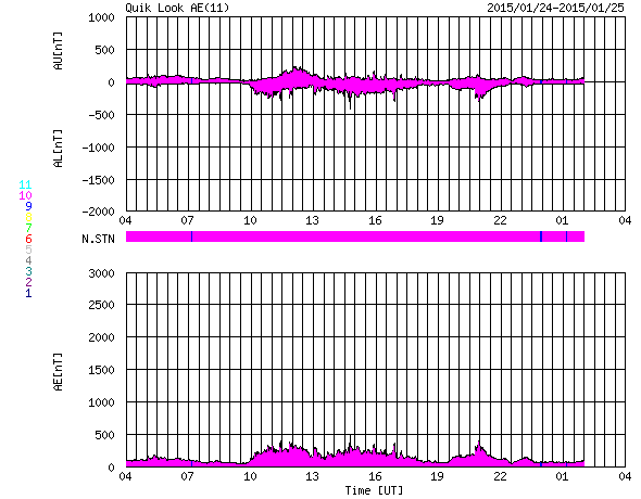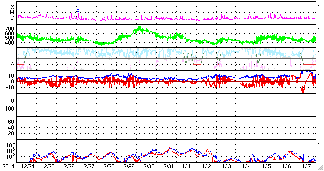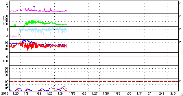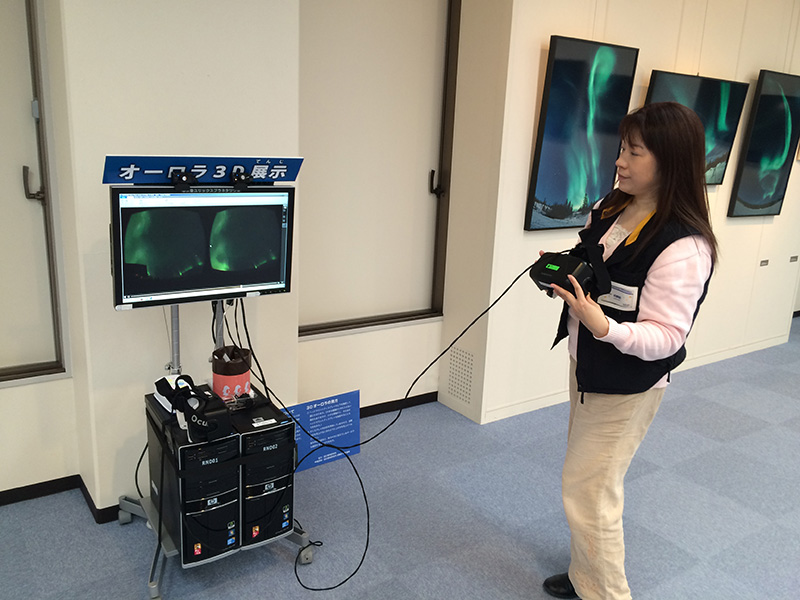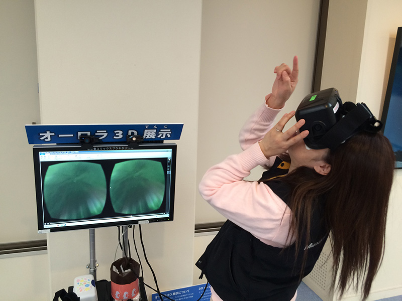 2015/ 1/25 12:21 更新 太陽風はやや低速になっています。太陽は穏やかです。 担当 篠原 福岡県近郊限定になるかもしれませんが、お勧め情報です。 福岡県宗像市の宗像ユリックスプラネタリウムでは、 1月から3月まで「オーロラ」に関するプログラムを投影しています。 これにあわせて、「オーロラ3D展示」が行われています。 (下の写真をどうぞ。実演はプラネタリウムの小野田さんです)。 国立極地研究所の片岡准教授により アラスカ・フェアバンクスの8km離れた2点で撮影された全天動画を、 立体視ソフトとヘッドマウントディスプレイを組み合わせて、 本当の空を見上げているかの様に観望する装置です。 頭を上に向けてあっちこっちに動かすと、 それにあわせて視野のオーロラが動くので、 見える方角や高度の変化をリアルに体験できます。 しかも、8kmの距離の威力で、 星空よりも手前の空中に浮かんでオーロラが見えるのです。 現在は、となりの部屋の「市民ギャラリー」で行われている 松澤一寛氏による「写真展 イエローナイフのオーロラ」 の会場に設置されています(素晴らしいオーロラの写真がたくさんあります)。 写真展終了後は、プラネタリウムに3月末まで展示するそうです。 とても動きがなめらかで、すっかり興奮して眺めてきました。 本物のオーロラ観望に少し近づけたかもしれません。 もし、お近くでしたらぜひご覧下さい。 太陽風は、速度が370km/秒に下がり、やや低速になっています。 磁場強度は5nTで安定しています。 27日周期の図では、 前周期は既に磁場強度が高まり、速度も上昇を始める頃ですが、 現在はまだ穏やかです。 今後の変化に注目して下さい。 太陽風磁場の南北成分は、やや南寄りに振れています。 このため、磁気圏では小規模の活動が続き、 AE指数は300nTの変化が長い時間続いています。 太陽は、2268黒点群で、 C2.0、C1.2の小規模フレアが発生した程度で、 穏やかです。 ![]() 福岡県の宗像ユリックスプラネタリウムで展示されている「オーロラ3D」装置。3月末まで。 (c) 宇宙天気ニュース ![]() 見上げると、その位置のオーロラが動画で立体的に見えます。とてもきれいでした。 (c) 宇宙天気ニュース ![]() SDO衛星のAIA193カメラによる太陽コロナの様子 (c) SDO (NASA) ![]() SDO衛星による太陽の可視光写真。マウスの矢印を写真に重ねると、黒点番号付きの写真に切り替わります。 (c) SDO (NASA) ![]() ACEが観測した太陽風の磁場(1番上の枠、白線は全体の強度、赤線は南北成分) および、太陽風の密度(3番目の橙線)、速度(4番目の黄線) (c) NOAA/SWPC ![]() リアルタイムAE指数 下段のAEグラフの値が高くなると、オーロラ活動が活発化しています。 (c) 京都大学, NICT ![]() 27日の太陽周期に合わせたデータプロット 太陽が同じ面を地球に向けていた27日前の変化から、今後を予想することができます。 (c) 作図:宇宙天気ニュース